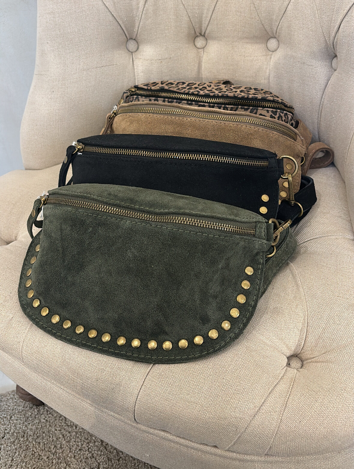 Adopte le look rock et tendance avec cette superbe banane en daim cloutée ! Sa matière effet daim ultra douce apporte une touche bohème, tandis que les clous métalliques viennent dynamiser le tout pour un rendu à la fois chic et rebelle.