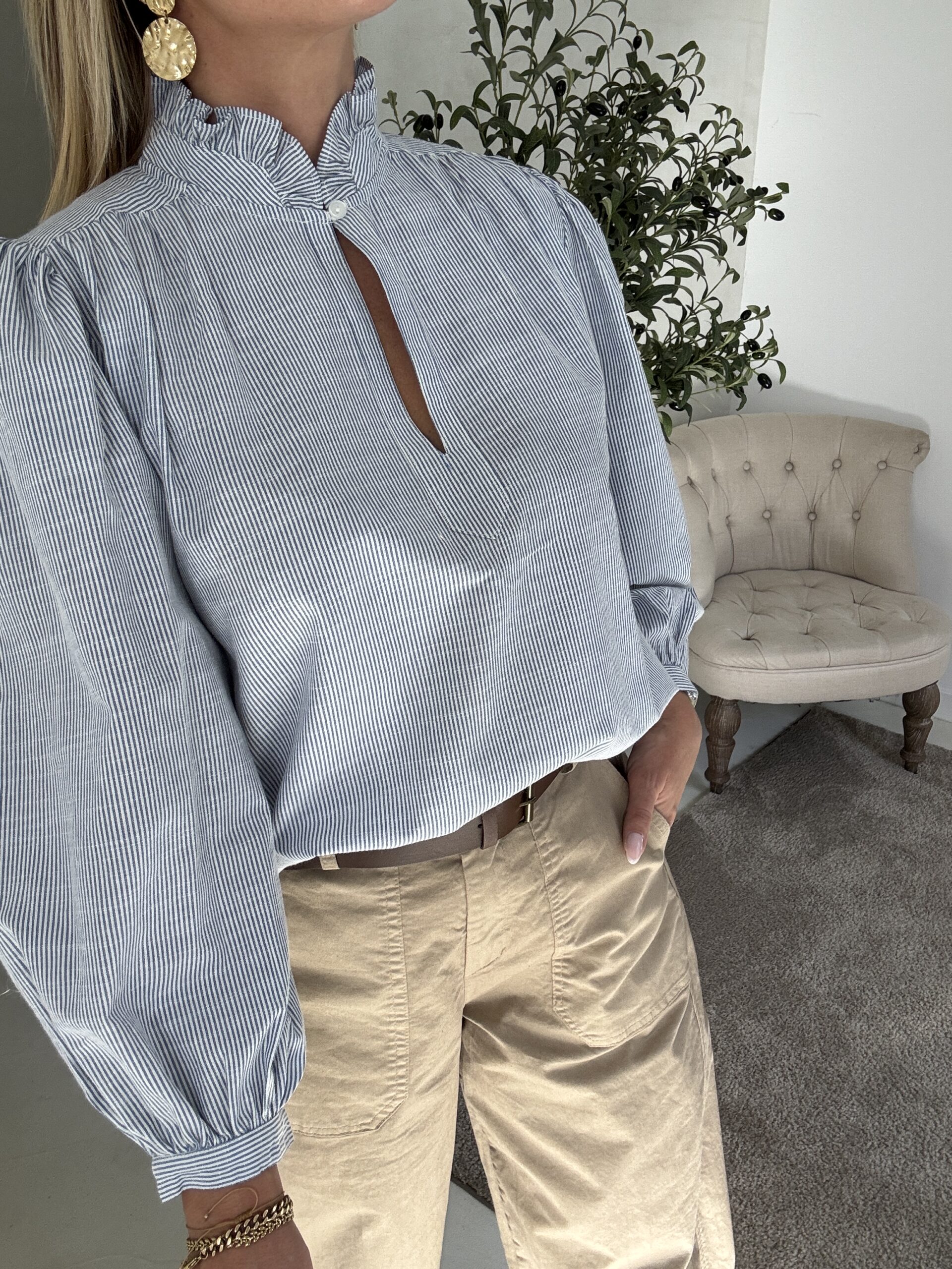 Élégante et moderne, cette blouse à rayures bleues combine un col montant avec une encolure V pour une touche chic et féminine. Ses manches bouffantes apportent du volume et du caractère, parfait pour un look tendance et sophistiqué.