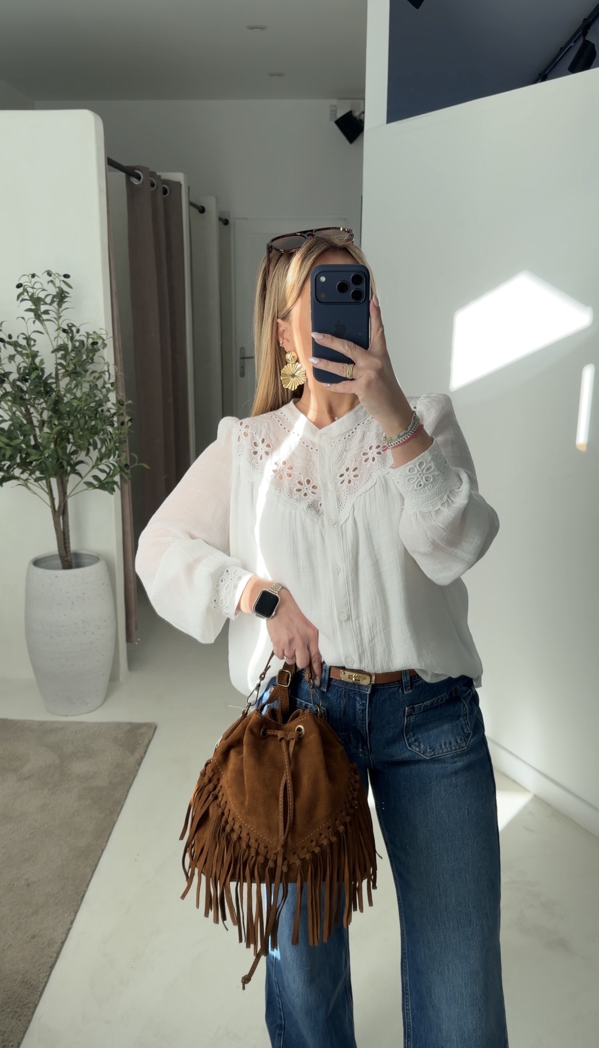 Blouse blanche ajourée sur la poitrine et aux poignets