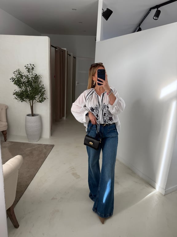 Blouse blanche avec broderies marine bohème