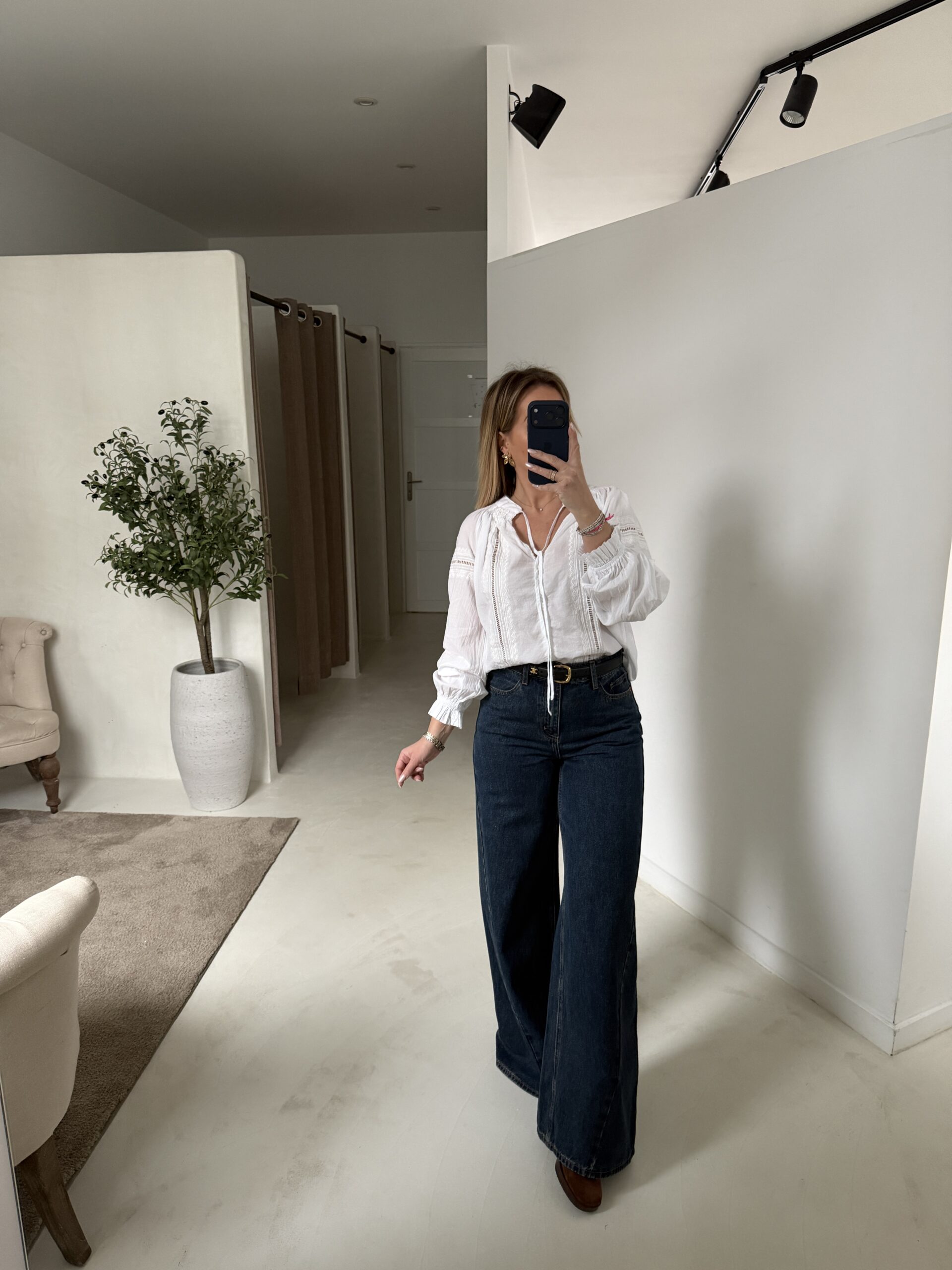 Blouse légère blanche ajourée, col V avec fils à nouer, féminine et élégante. Parfaite avec un jean, un pantalon ou une jupe pour un look chic et décontracté.