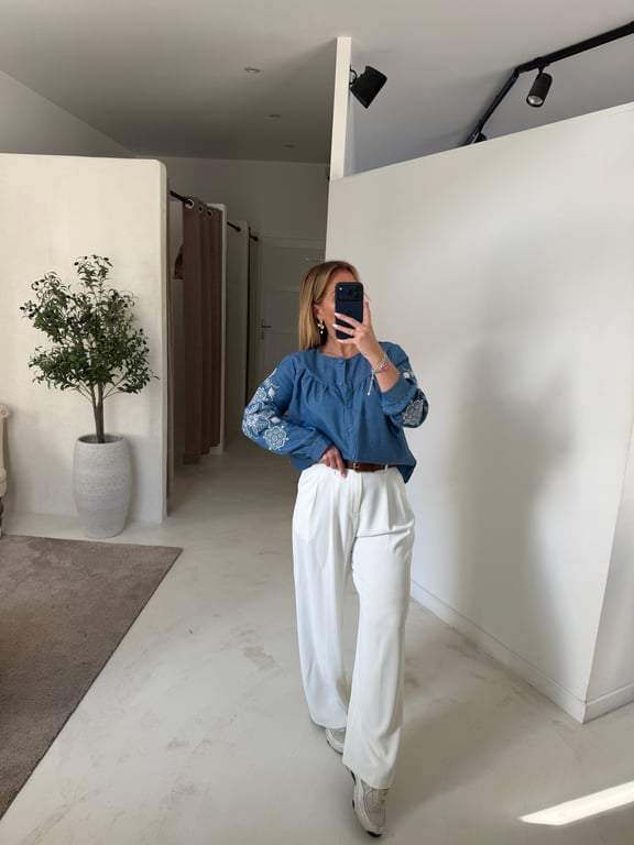 Blouse bleue à broderies fleurs sur les manches : le haut féminin et raffiné qui sublime vos tenues. Cette blouse femme séduit par ses détails brodés délicats sur les manches, apportant une touche romantique et élégante. Sa coupe fluide assure confort et style au quotidien. Facile à associer avec un jean, un pantalon ou une jupe, elle s’intègre parfaitement dans un look casual chic, à compléter avec vos accessoires et chaussures préférés.