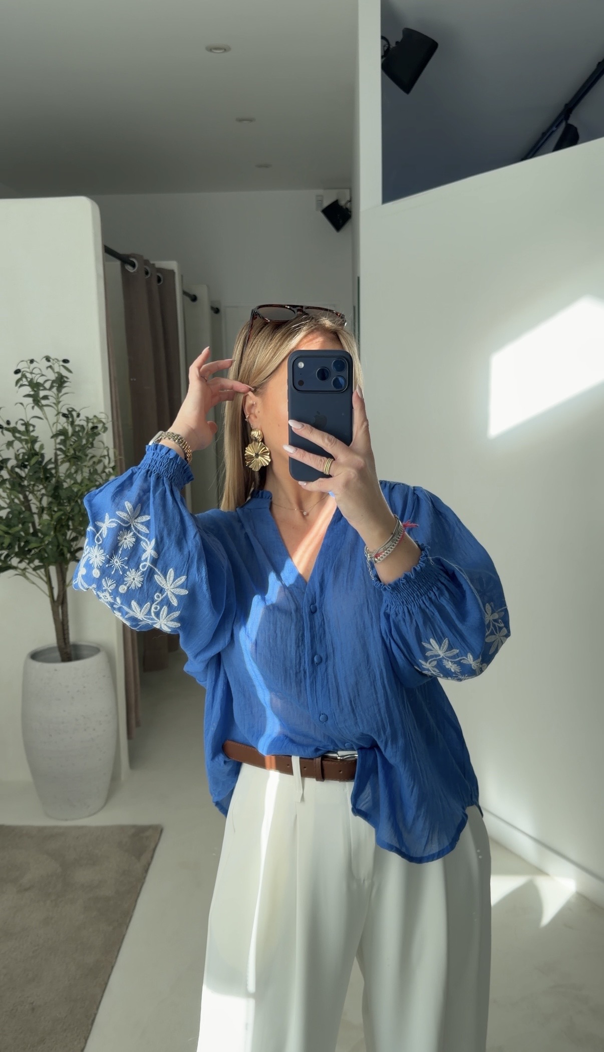 Blouse bleu avec broderies fleurs aux manches