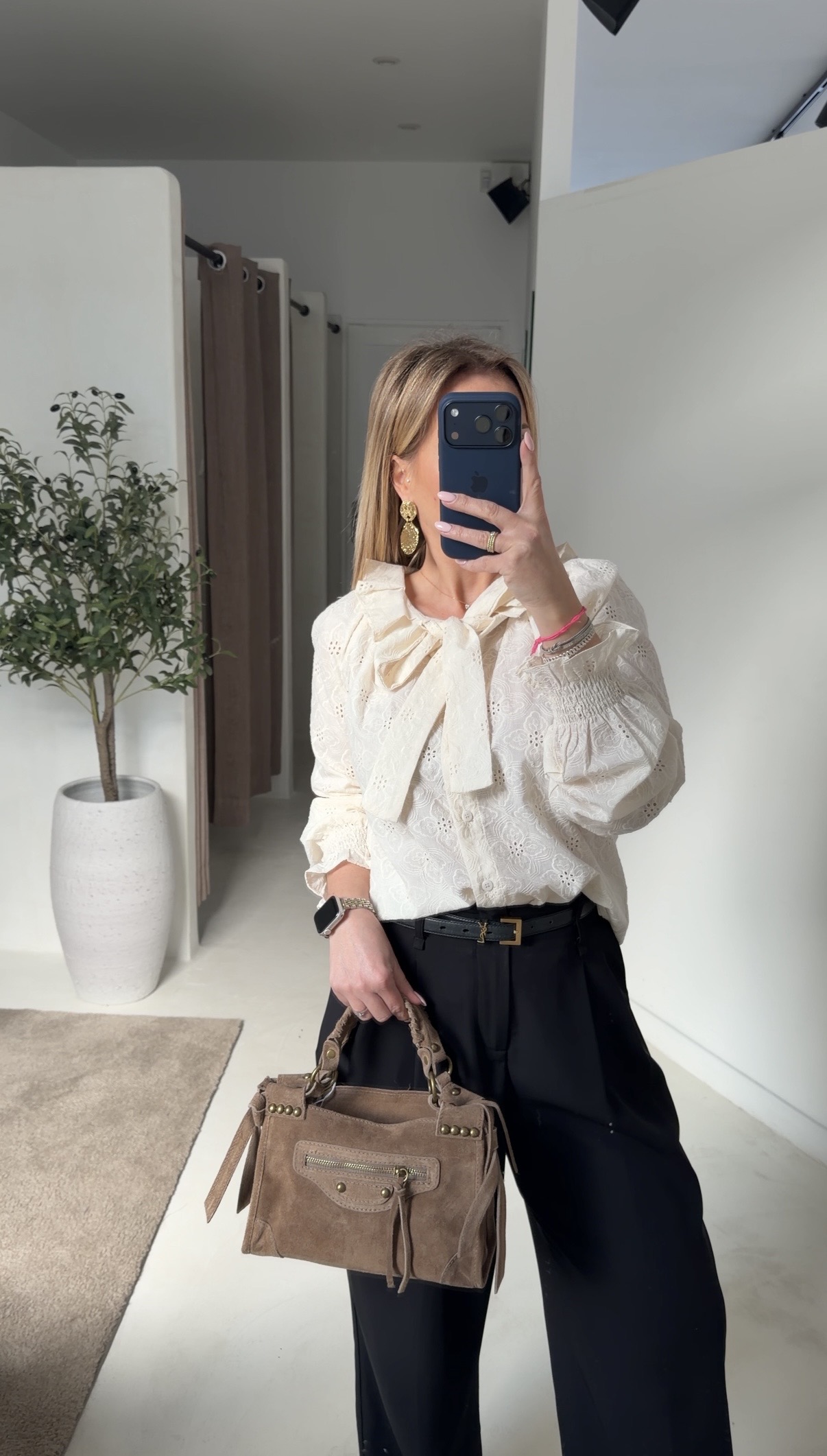 Cette blouse écru brodée est une pièce élégante et féminine qui apporte tout de suite du charme à vos tenues. Son col à nouer raffiné souligne la délicatesse de la pièce et structure joliment la silhouette, tandis que les broderies ajoutent une touche romantique et sophistiquée.