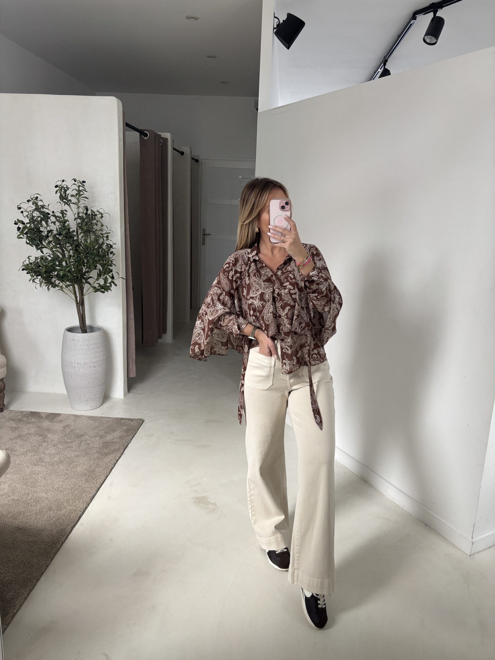 Osez l’originalité avec cette blouse marron aux motifs délicats. Son détail signature : des volants travaillés qui s’épanouissent comme une mini-cape, apportant un mouvement et une sophistication spectaculaires. Une pièce forte, parfaite pour transformer un jean simple en tenue de soirée.