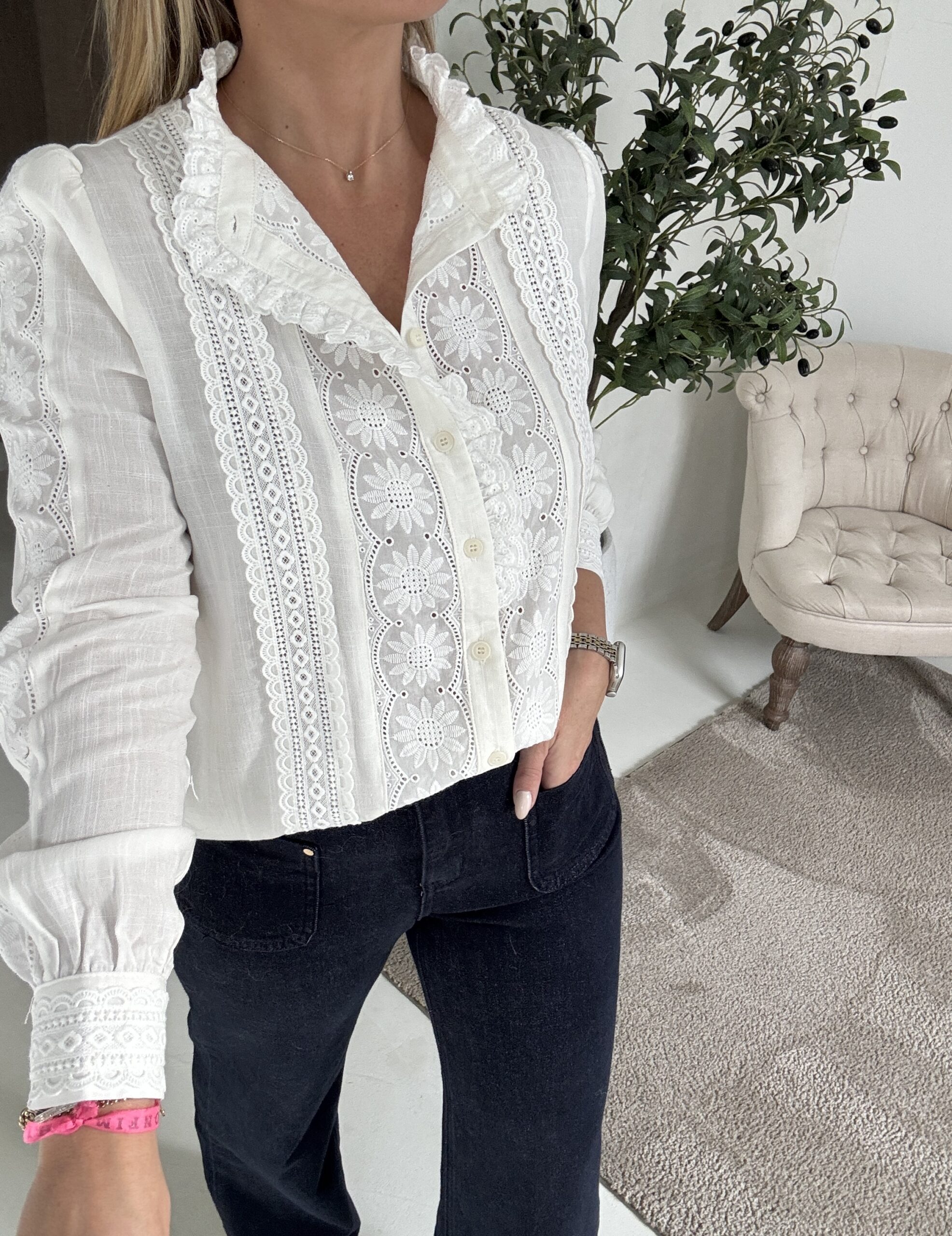 Blouse écrue femme en broderie anglaise, à la fois romantique et élégante. On adore ses détails délicats et sa coupe fluide qui mettent en valeur la silhouette. Parfaite avec un jean, une jupe ou un pantalon clair pour un look frais et féminin.