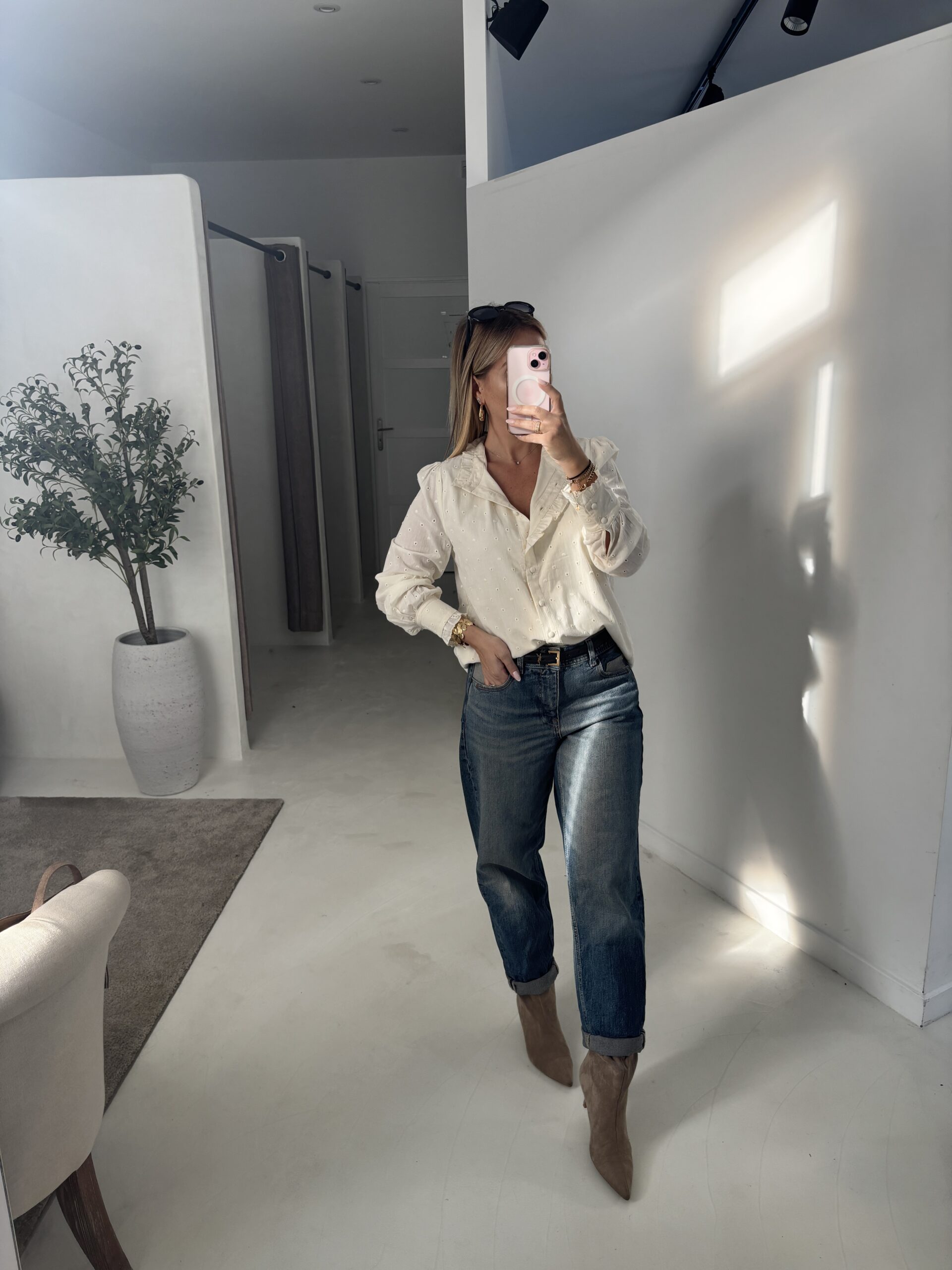 Craquez pour cette blouse blanc cassé à pois ajourés, une pièce délicate et élégante qui apporte légèreté et raffinement à vos tenues. Ses détails ajourés en forme de pois lui donnent une touche romantique et moderne à la fois, parfaite pour un look féminin en toute saison.