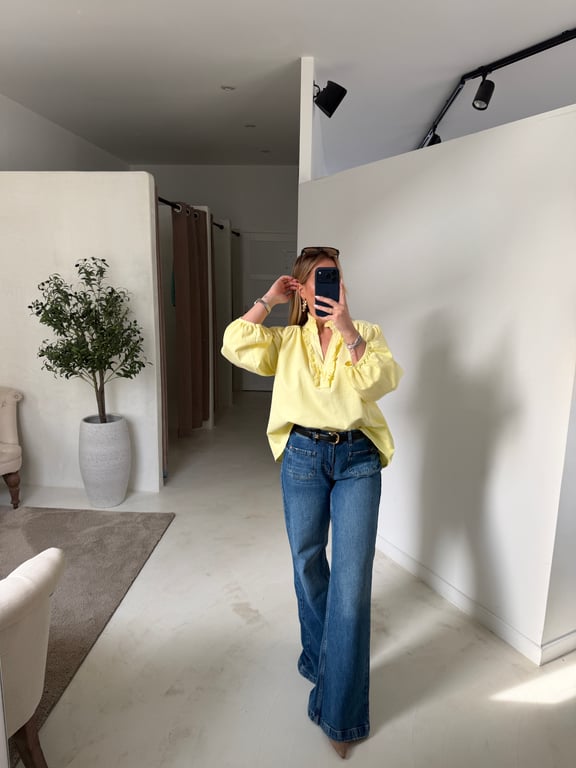 La blouse en jean jaune col V taille unique est un haut lumineux et décontracté, parfait pour apporter de la couleur à un look casual. Le col V souligne la silhouette tout en restant confortable et facile à porter.
