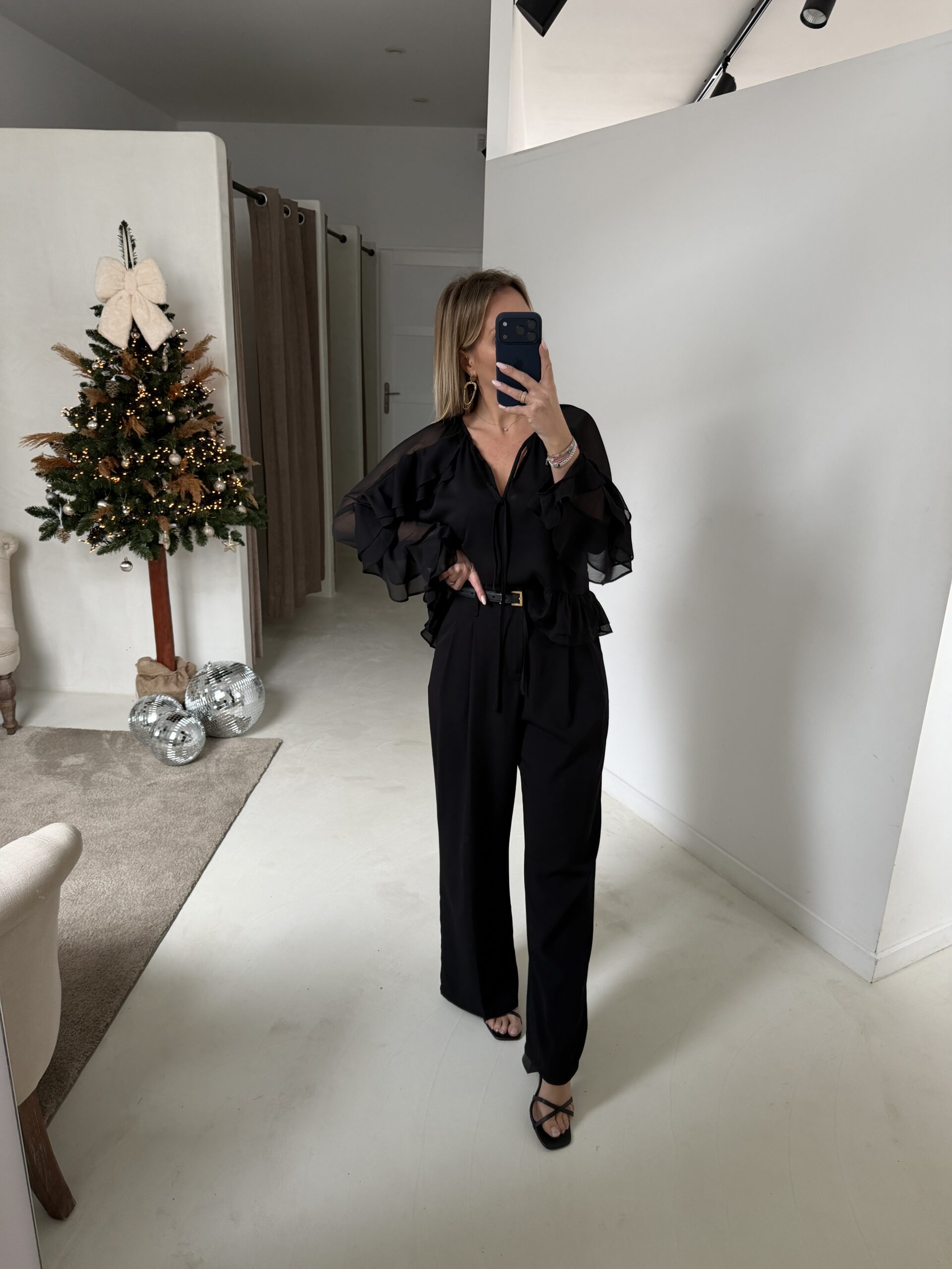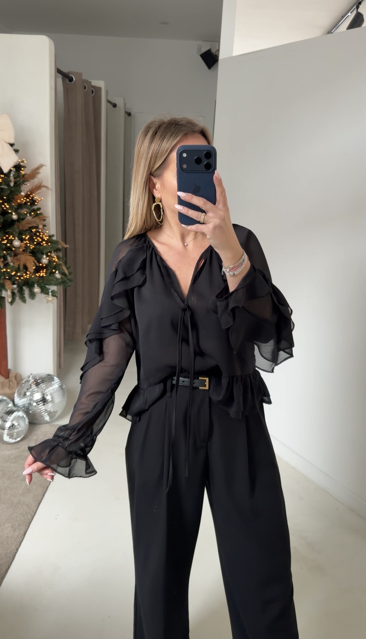 Apportez une touche de romantisme à vos tenues avec notre blouse noire à volants et col V, une pièce délicate et féminine qui allie élégance et modernité. Les volants apportent du mouvement et du charme, tandis que le col V met en valeur la silhouette avec subtilité.