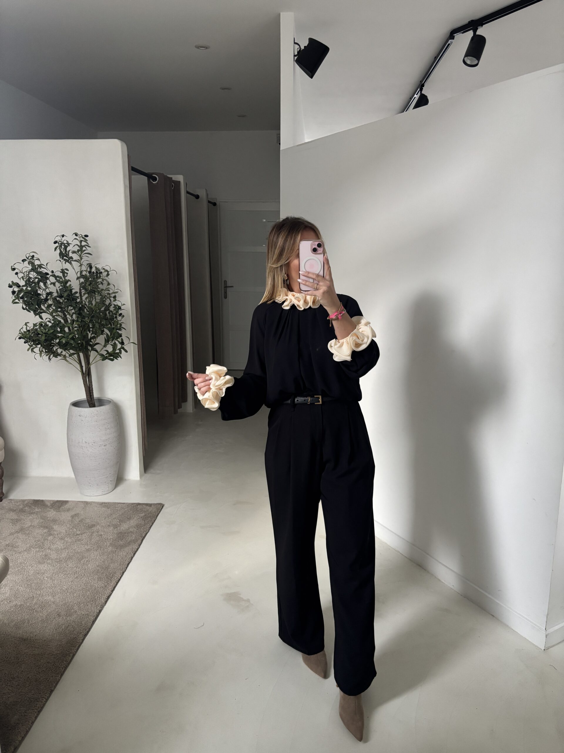 Cette blouse noire est un classique instantané, rehaussée par un contraste floral saisissant. Le motif fleuri sur le col et les poignets apporte une touche de fraîcheur et de féminité inattendue. Parfaite pour le bureau ou un dîner chic, elle ne nécessite aucun accessoire.