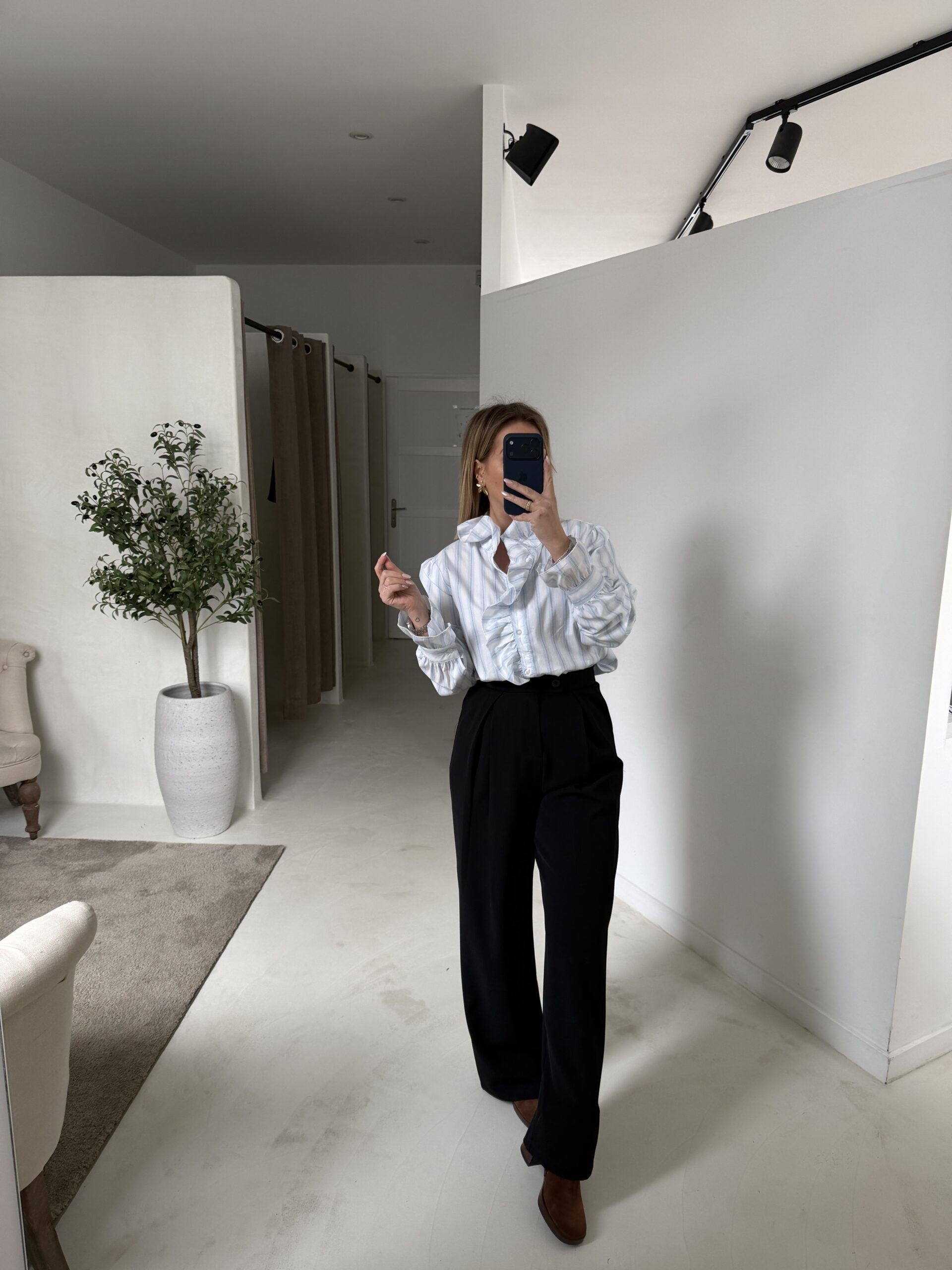 Blouse à rayures blanc et bleu avec volants.