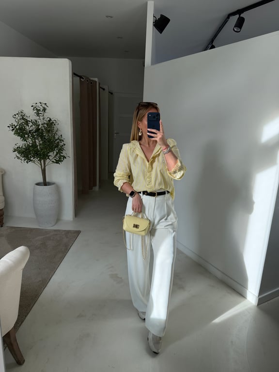 La blouse rayée jaune avec des volants discrets au col est un haut lumineux et féminin, parfait pour apporter de la gaieté à un look. Les volants ajoutent une touche délicate et élégante sans surcharger la pièce.