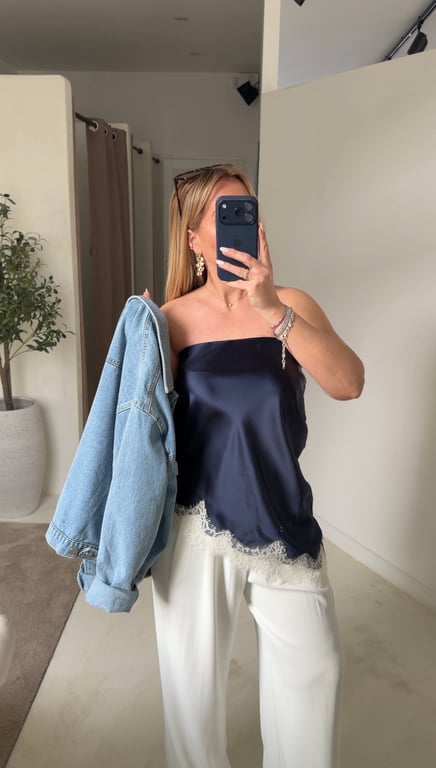 Le bustier effet soie asymétrique avec dentelle blanche dans le bas est un haut chic et féminin, idéal pour sublimer une tenue élégante. L’effet soie apporte de la fluidité tandis que la dentelle ajoute une touche romantique et raffinée.