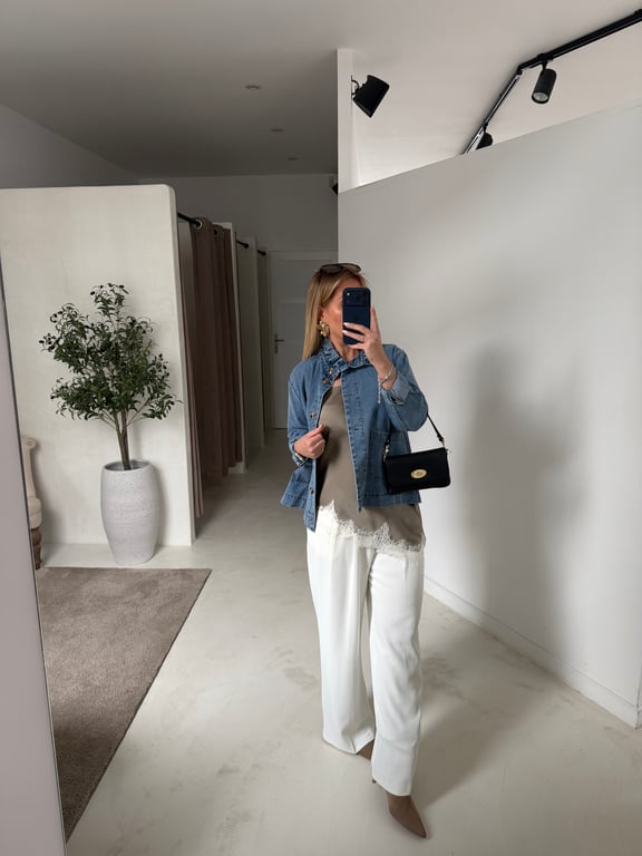 Le bustier effet soie asymétrique avec dentelle blanche dans le bas est un haut chic et féminin, idéal pour sublimer une tenue élégante. L’effet soie apporte de la fluidité tandis que la dentelle ajoute une touche romantique et raffinée.