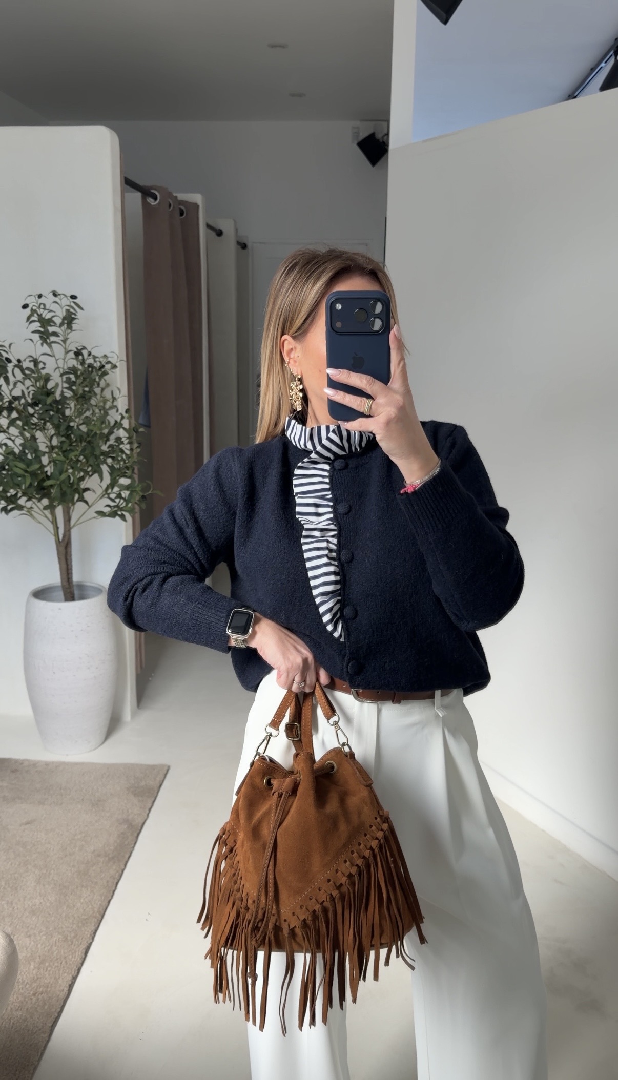 Gilet bleu marine avec col à volants rayé, chic et féminin. Sa coupe légère le rend facile à superposer sur une blouse, un t-shirt ou un pull. À porter avec un jean, un pantalon ou une jupe pour un look élégant et tendance au quotidien.