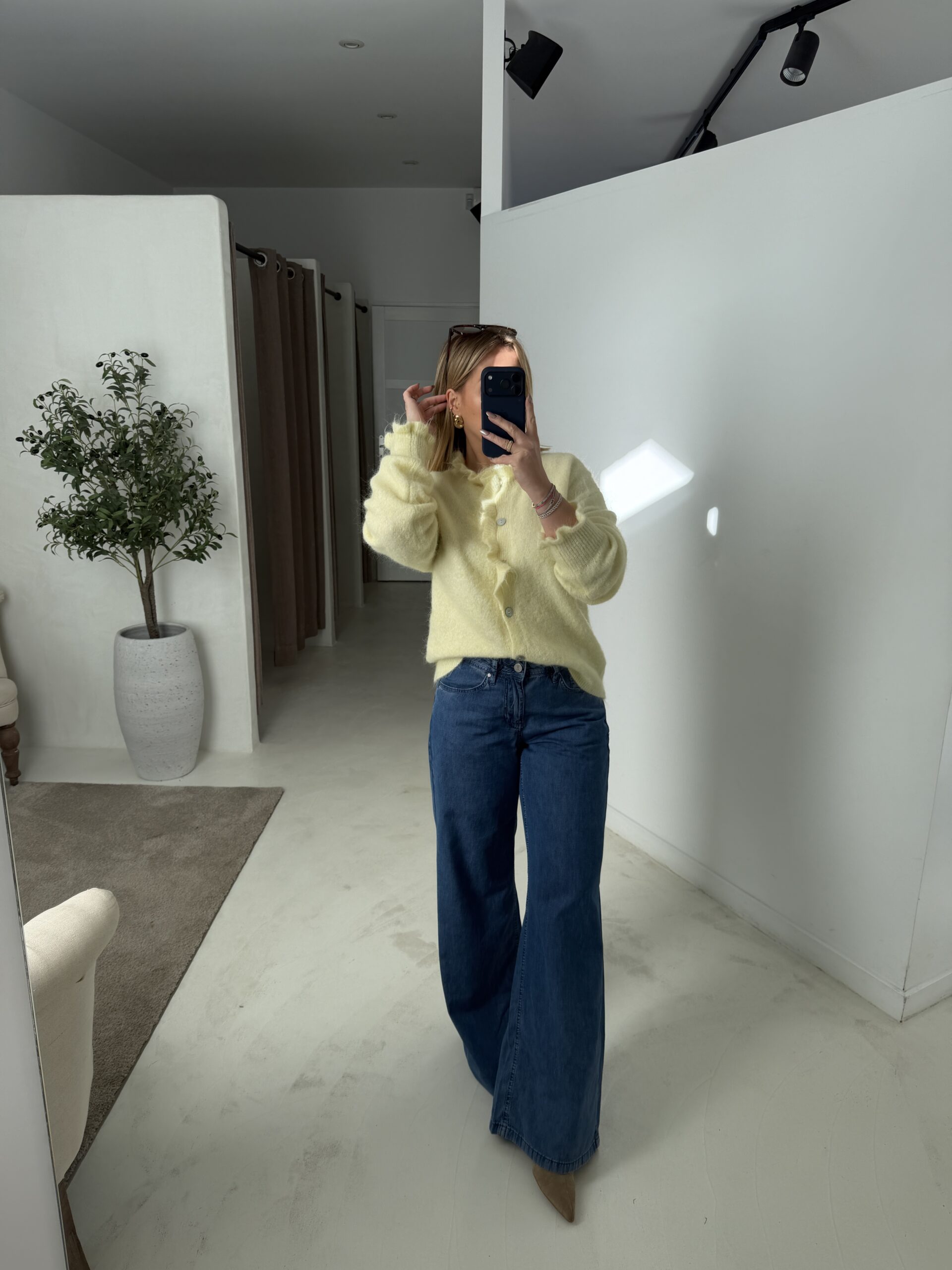 Ce gilet jaune orné de volants au col est une pièce féminine et pleine de peps pour vos tenues. Sa coupe légère le rend facile à superposer sur un t-shirt, une blouse ou un pull fin, tandis que les volants délicats apportent une touche élégante et tendance. À associer avec un jean, un pantalon ou une jupe, ce gilet femme illumine vos looks casual chic avec style.