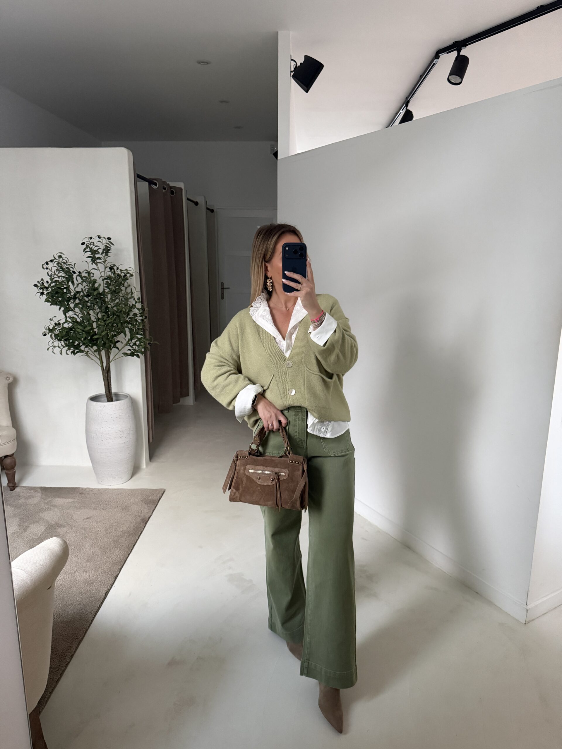 Gilet olive à boutons nacrés avec poches sur le devant, alliant élégance et confort. Sa coupe facile à porter en fait une pièce pratique à superposer sur une blouse, un t-shirt ou un pull. À associer avec un jean, un pantalon ou une jupe pour un look décontracté et tendance au quotidien.