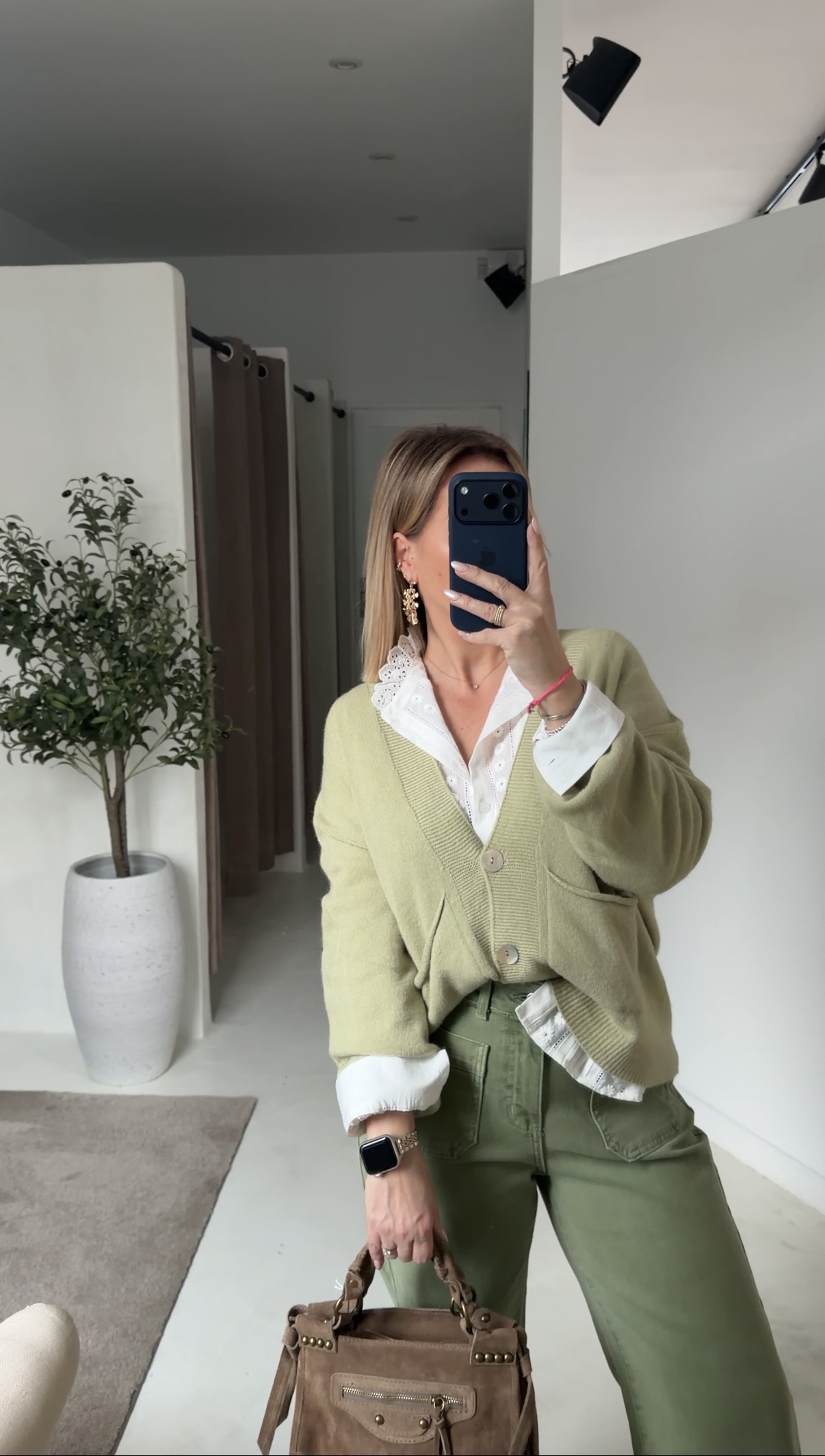 Gilet olive à boutons nacrés et poches sur le devant