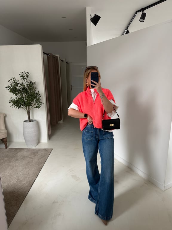 Gilet corail fluo sans manches à col montant : le haut tendance qui booste instantanément votre look. Ce gilet femme apporte une touche de couleur vive et moderne à toutes vos tenues. Sa coupe sans manches et son col montant structurent la silhouette tout en restant confortable. À associer avec un t-shirt, une chemise, un jean ou un pantalon, il dynamise facilement vos looks du quotidien. Un indispensable pour un dressing féminin, stylé et audacieux.