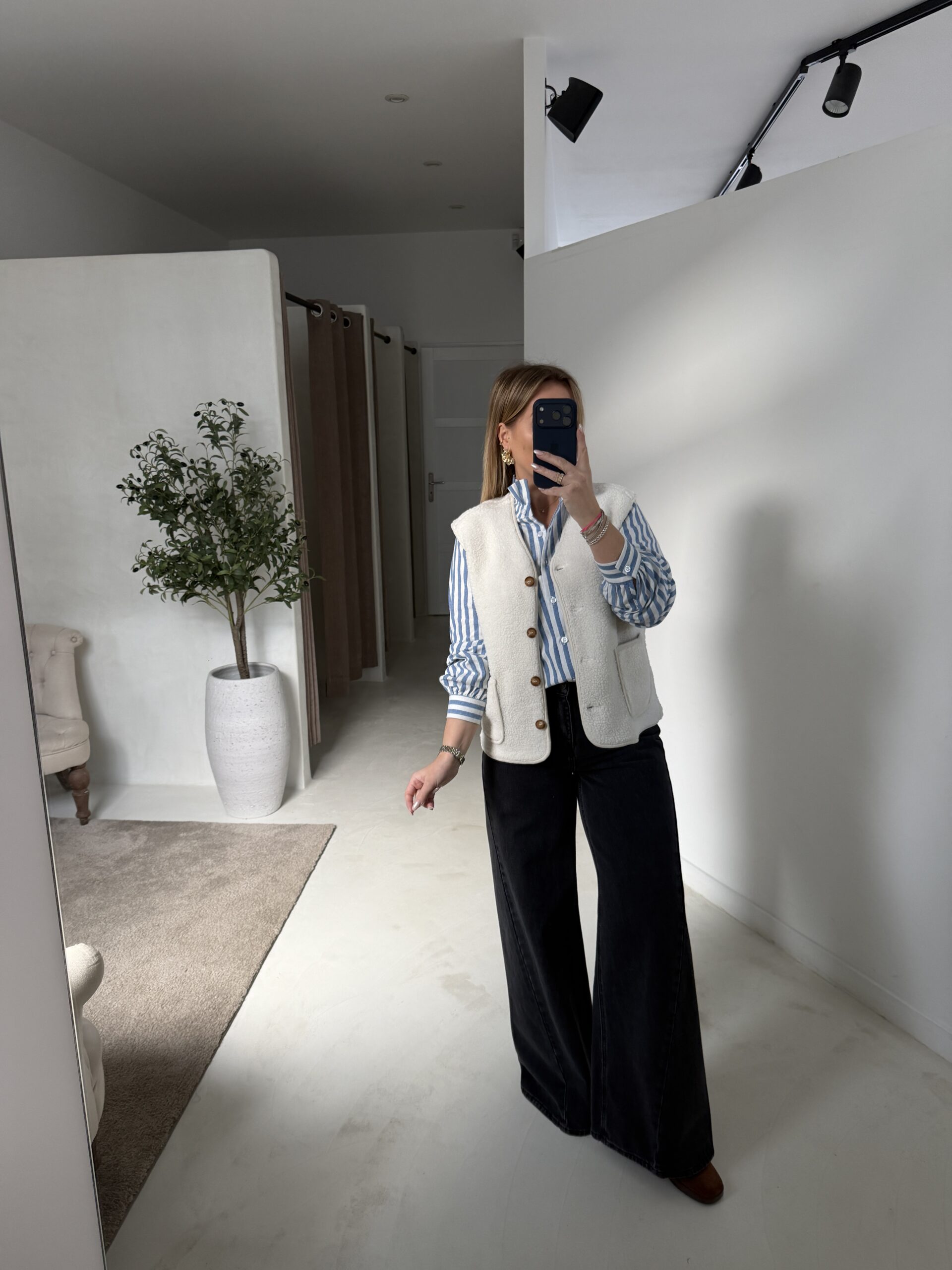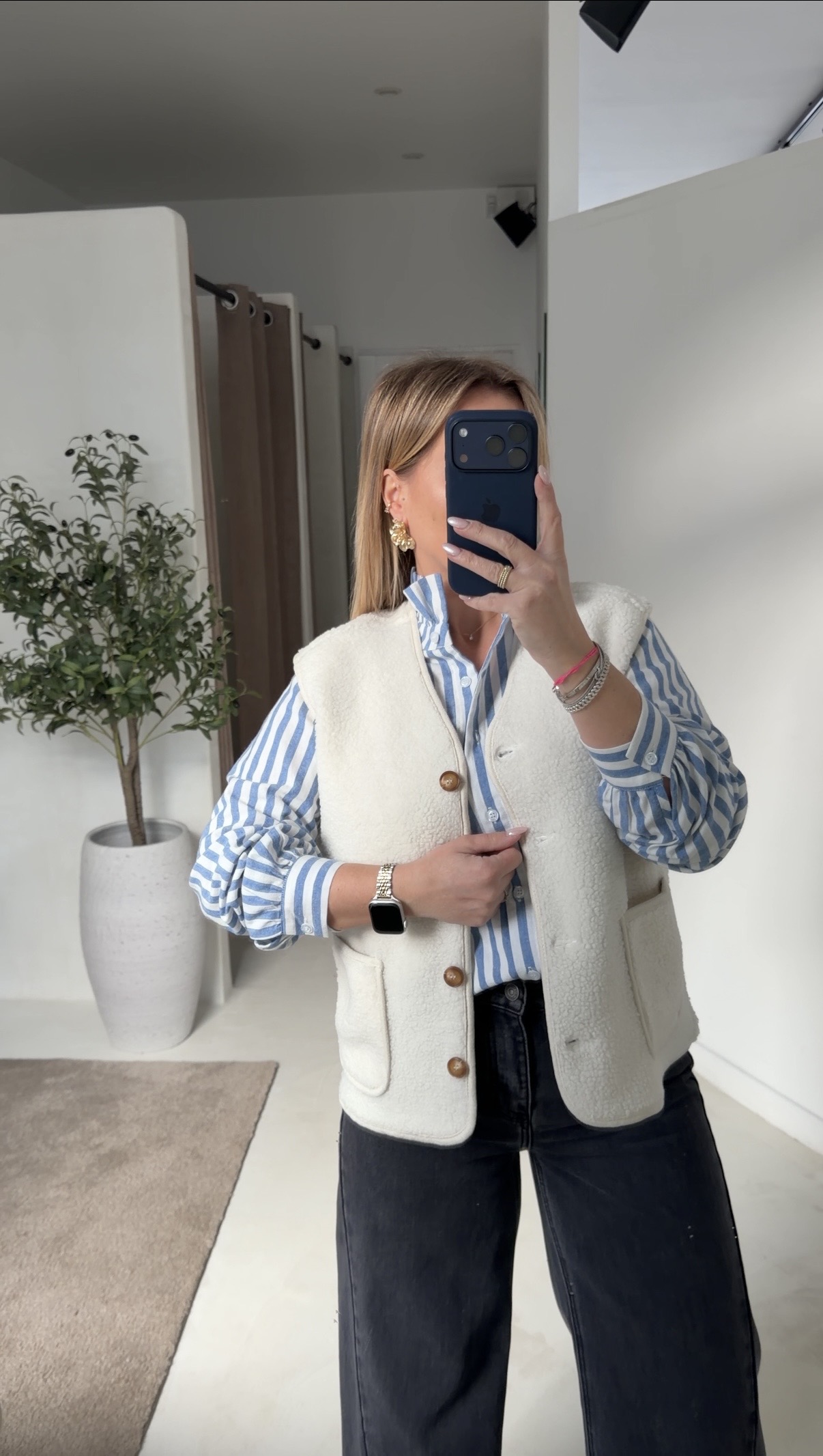 Gilet sans manches molletonnée blanche, légère et confortable, idéale pour les journées fraîches ou pour superposer sur un pull ou un sweat. Sa coupe pratique et épurée permet de rester au chaud tout en conservant un look moderne et casual.