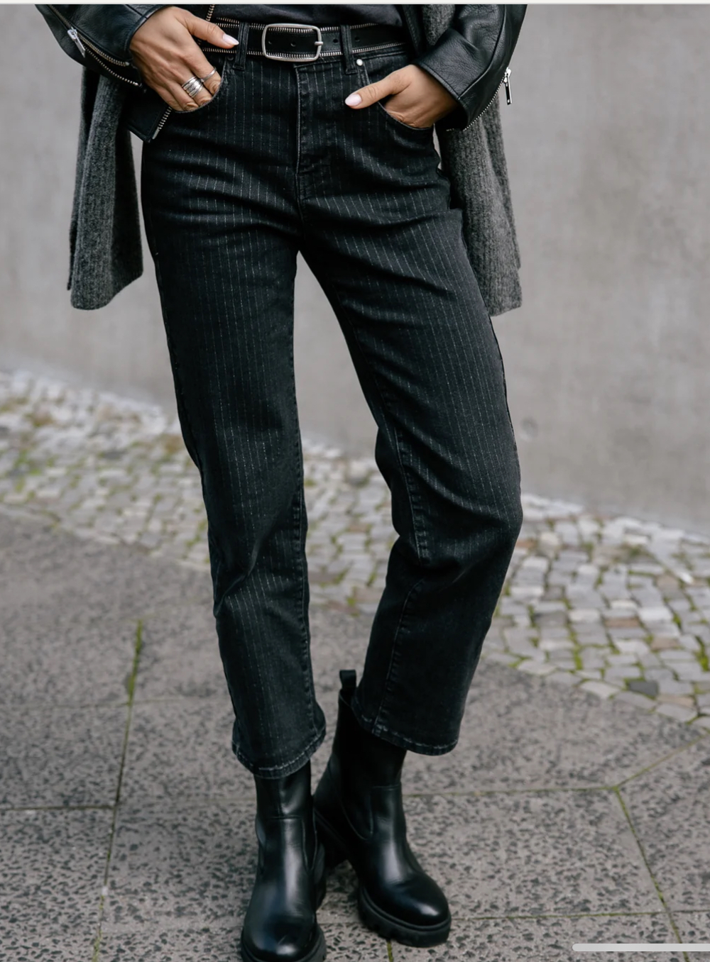 • Délavage noir, usé, avec rayures fantaisies argentées