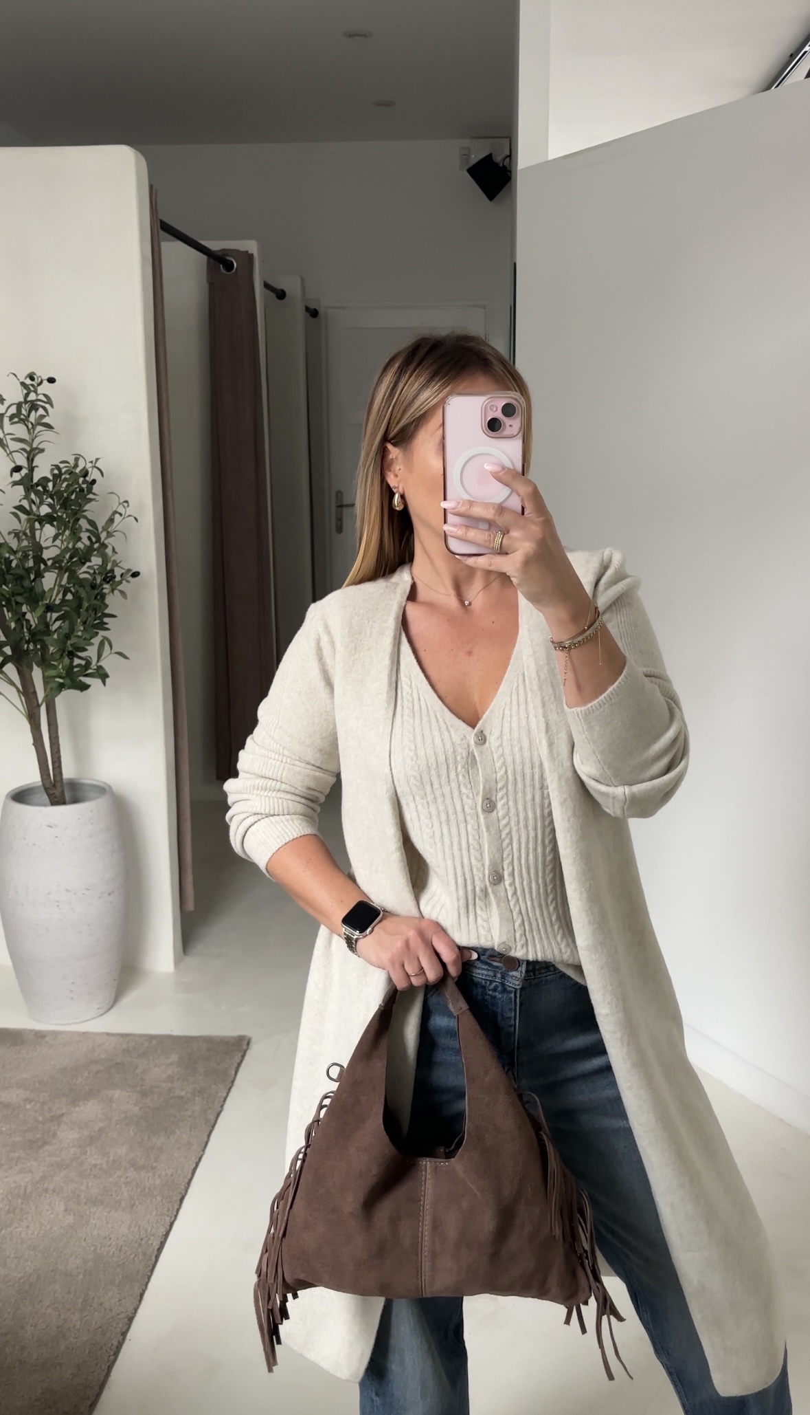 Ce long cardigan est fabriqué à partir d’un doux mélange de laine et comporte un gilet fixe avec des détails en tricot torsadé et une fermeture à boutons. Conçu avec une encolure en V, des manches longues et une coupe droite, il offre un look élégant et superposé. Le mélange des textures apporte une touche raffinée.