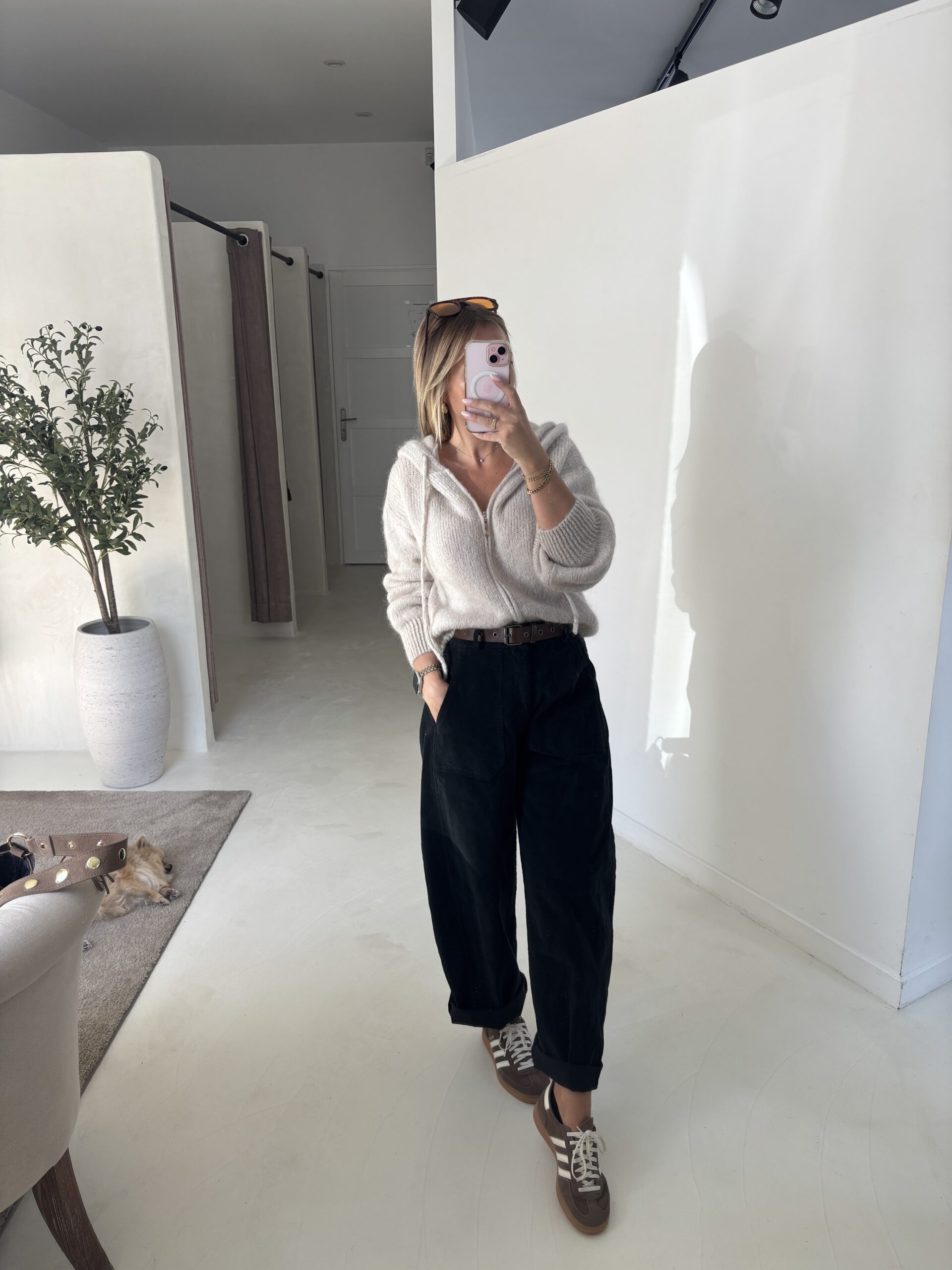 Pantalon ballon noir en velours ceinturé, confortable et stylé, parfait pour un look décontracté mais chic.
