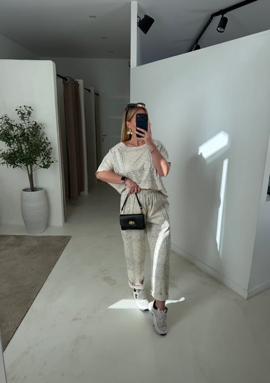 Craquez pour ce pantalon droit beige à motifs bandana, une pièce tendance et confortable à adopter au quotidien. Sa coupe droite et sa taille unique s’adaptent facilement à différentes silhouettes tout en assurant un joli tombé. Ce bas se porte aussi bien avec un t-shirt, un pull, un gilet ou une blouse pour un look casual chic. Idéal avec des baskets ou des sandales, il apporte une touche moderne et stylée à votre dressing.