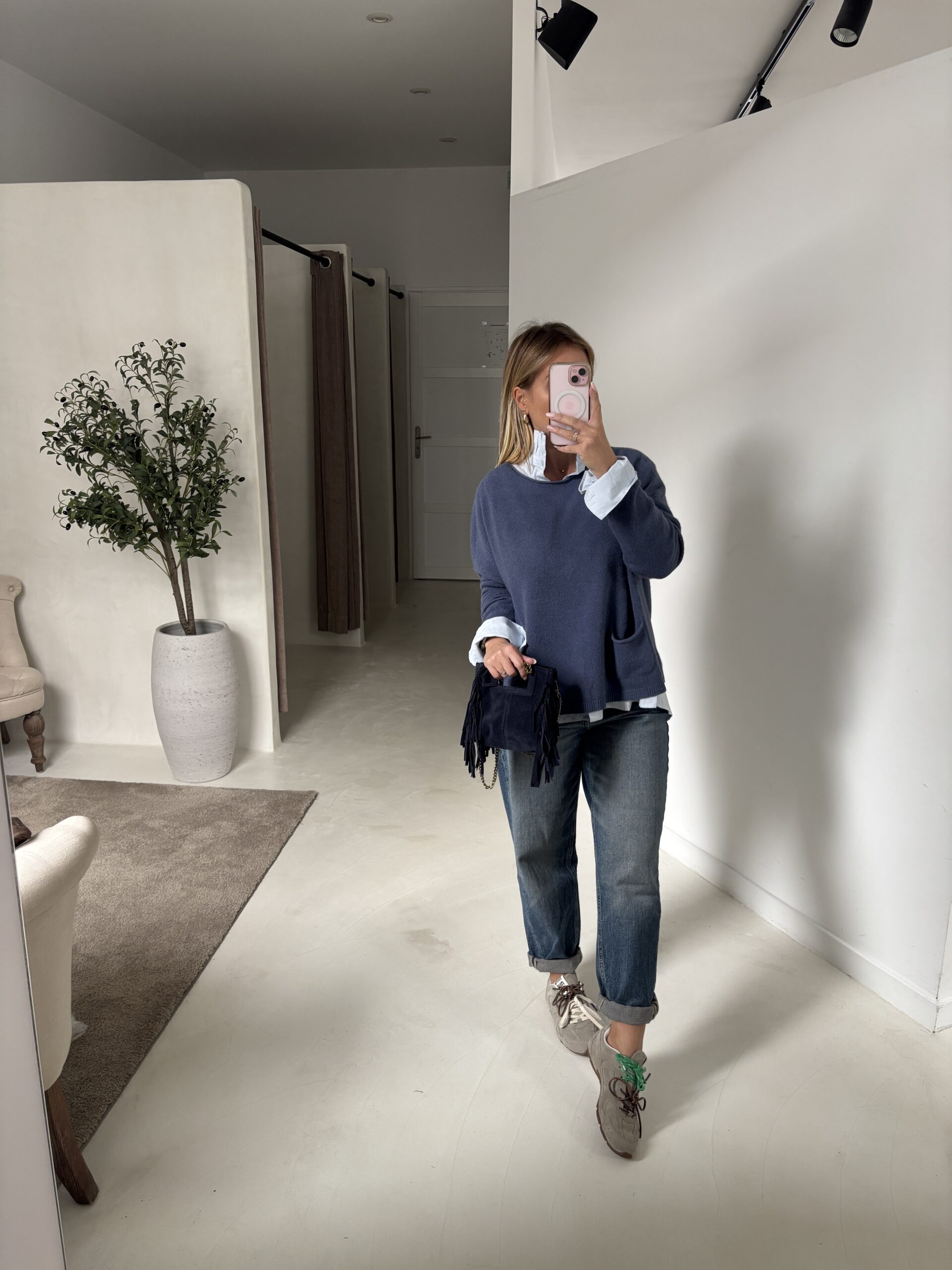 Pull bleu jean col rond avec poches