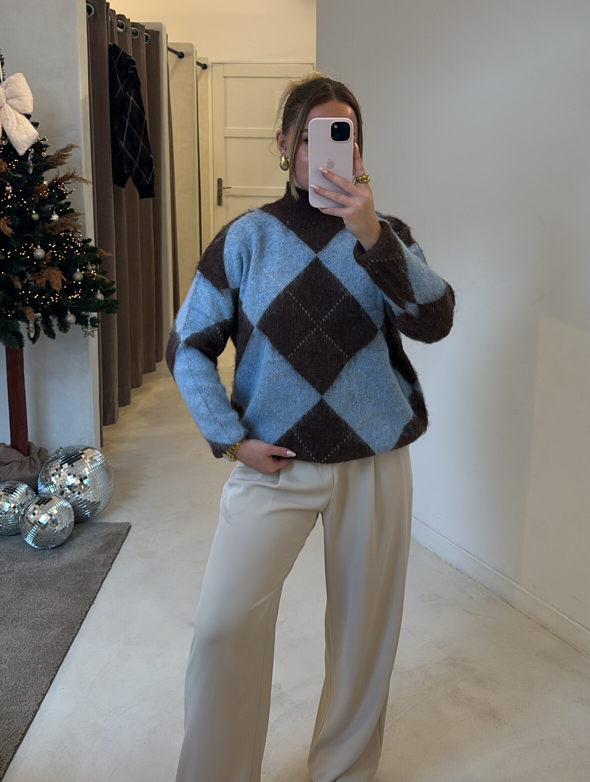 Adoptez un look graphique avec notre pull col montant à carreaux bleu et marron, une pièce tendance qui conjugue confort et caractère. Sa maille douce apporte une chaleur agréable, tandis que son motif à carreaux crée un contraste élégant, idéal pour l’automne-hiver.