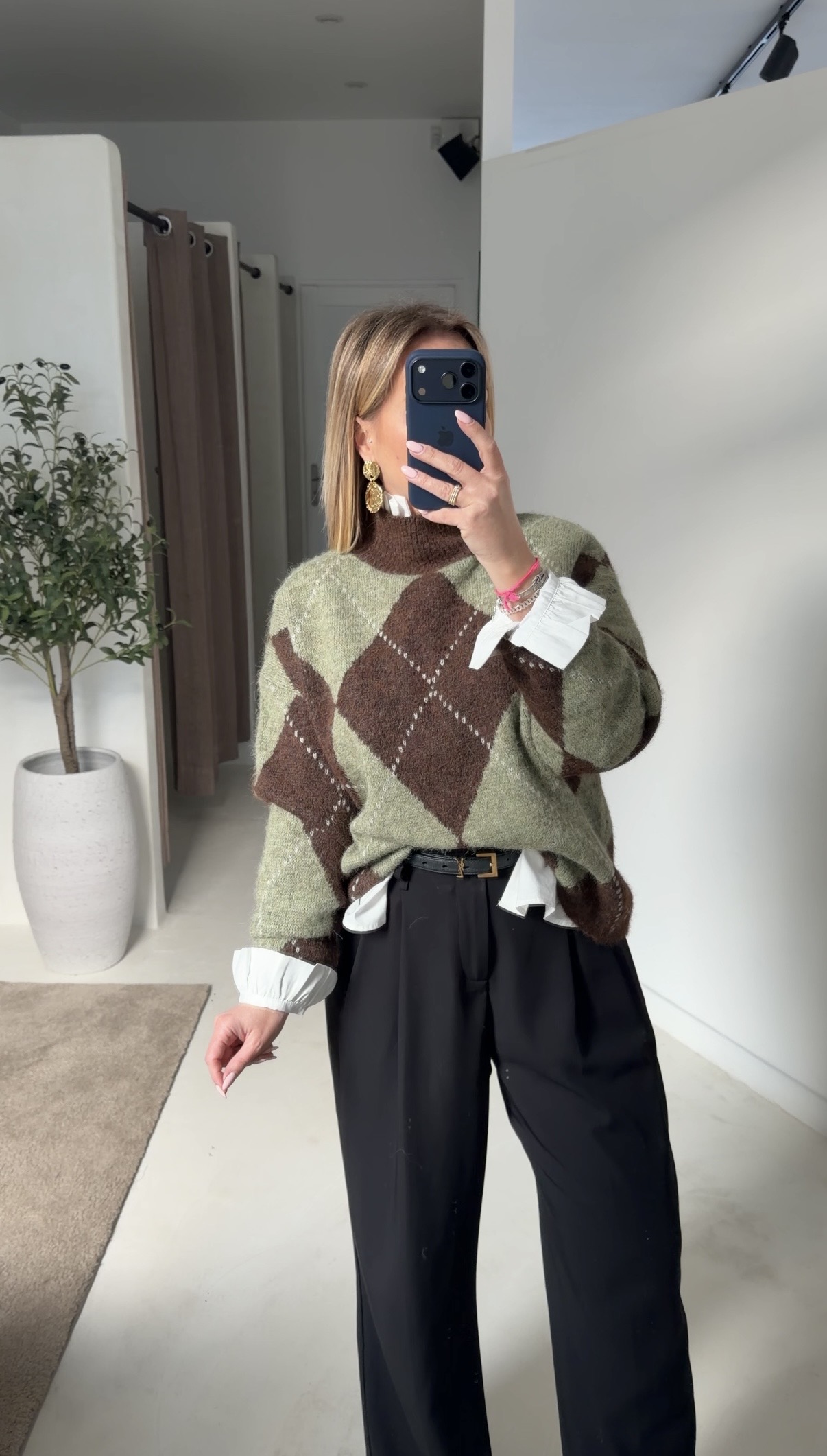 Pull col montant à carreaux vert et marron