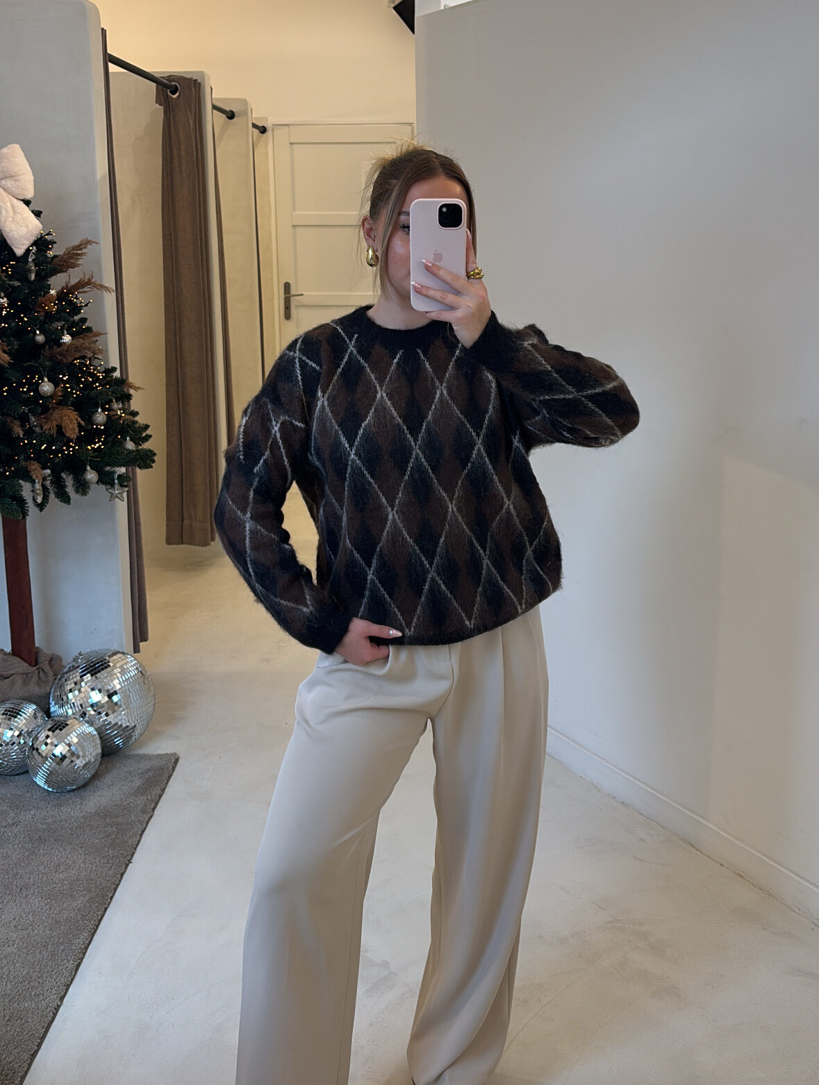 Adoptez un look graphique avec notre pull col rond à carreaux noir et marron, une pièce tendance qui conjugue confort et caractère. Sa maille douce apporte une chaleur agréable, tandis que son motif à carreaux crée un contraste élégant, idéal pour l’automne-hiver.