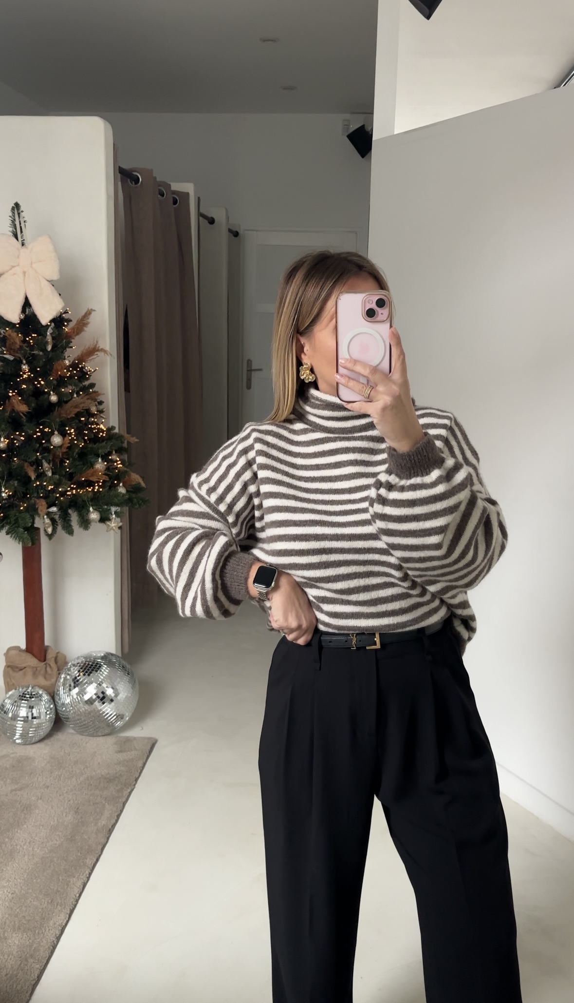 Adoptez un style moderne avec notre pull col roulé rayé blanc et marron, une pièce cosy qui mêle élégance et originalité. Ses rayures contrastées apportent du dynamisme à la silhouette, tandis que son col roulé offre une chaleur agréable pour les journées fraîches.