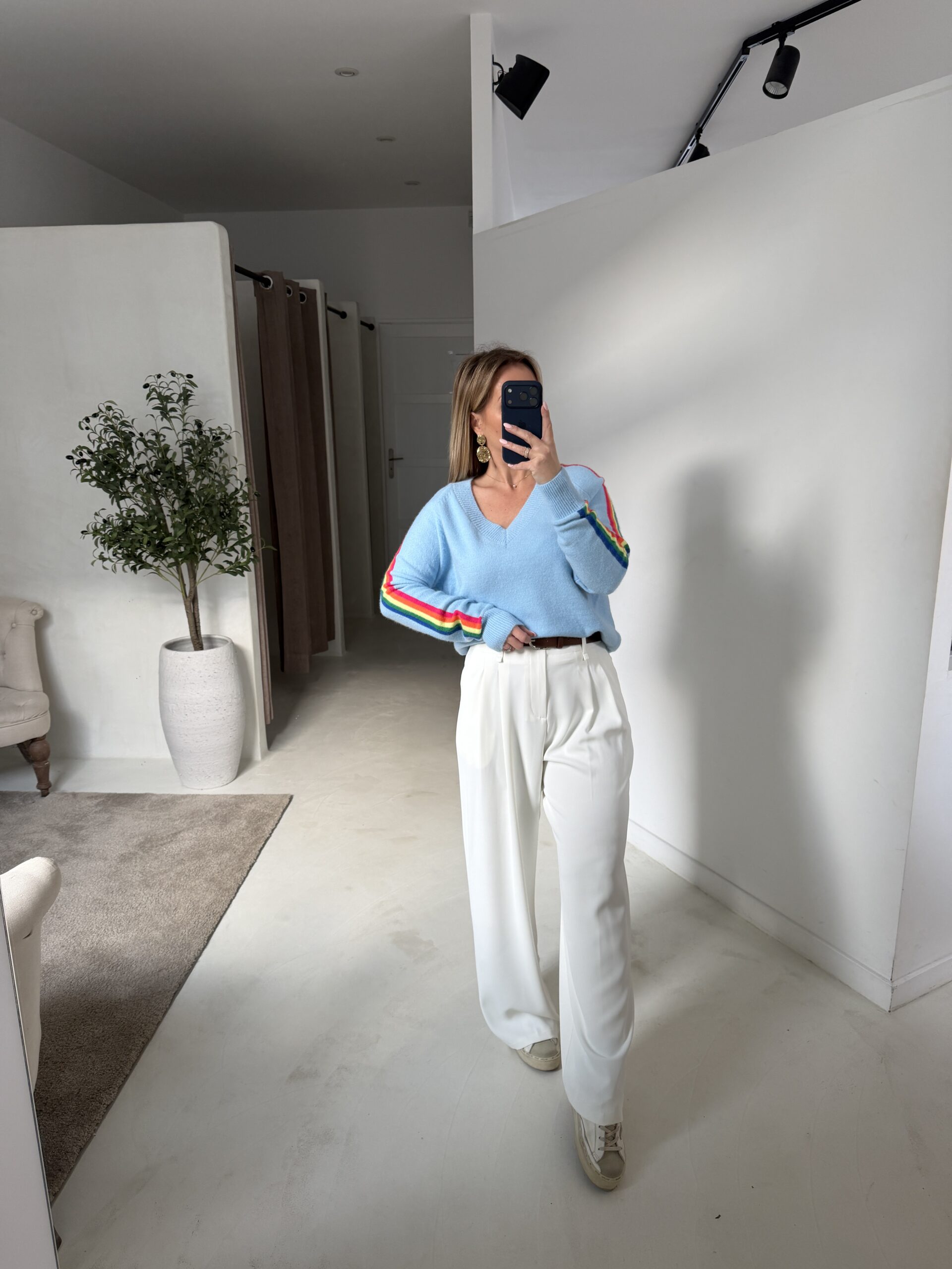 Laissez entrer la couleur dans votre dressing avec notre pull col V bleu ciel, sublimé par de superbes manches aux détails arc-en-ciel tout le long. Le contraste entre le bleu et les nuances lumineuses crée un effet visuel canon, parfait pour apporter une touche fun et féminine à vos tenues du quotidien.