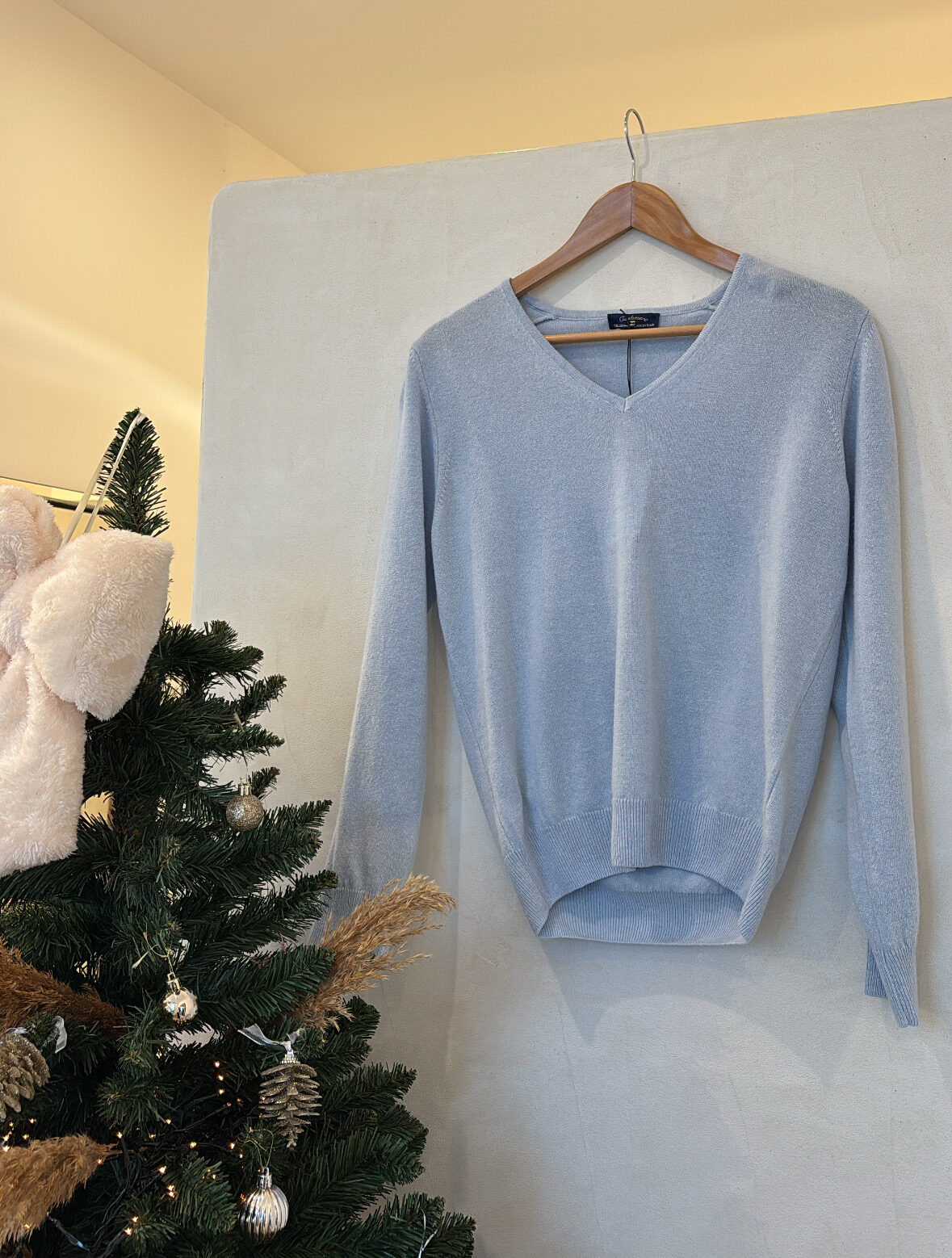 Pull col V bleu ciel, laine et cachemire
