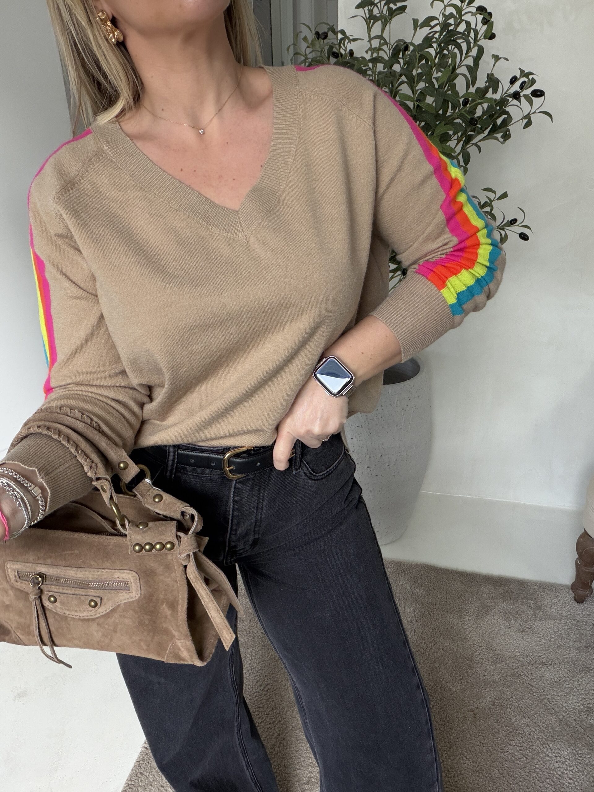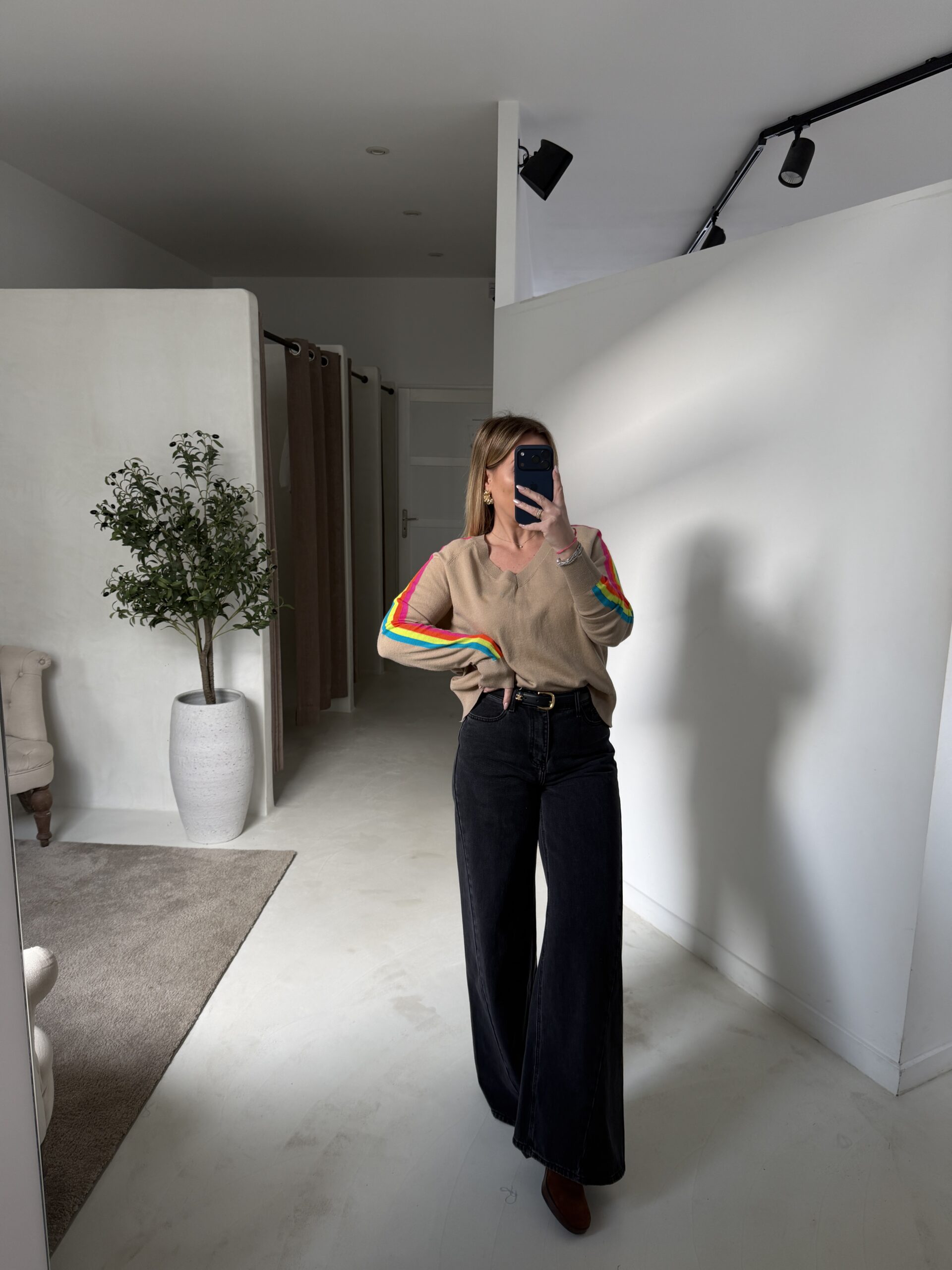 Laissez entrer la couleur dans votre dressing avec notre pull col V beige, sublimé par de superbes manches aux détails arc-en-ciel tout le long. Le contraste entre le rose  et les nuances lumineuses crée un effet visuel canon, parfait pour apporter une touche fun et féminine à vos tenues du quotidien.