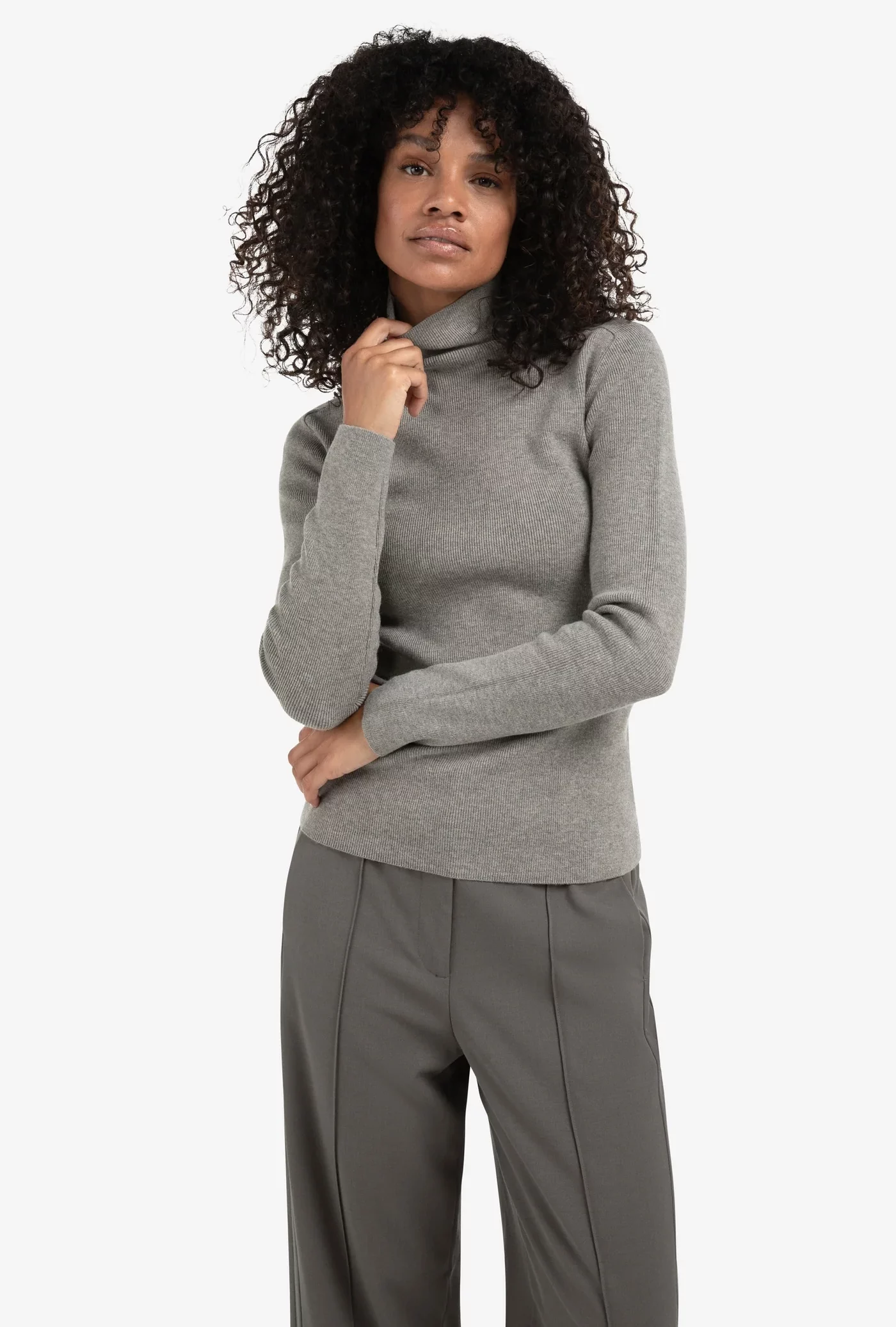 Ce haut côtelé doux présente un col roulé et une silhouette ajustée flatteuse. Confectionné en jersey extensible confortable, il présente des manches longues et une allure élégante qui épouse le corps.