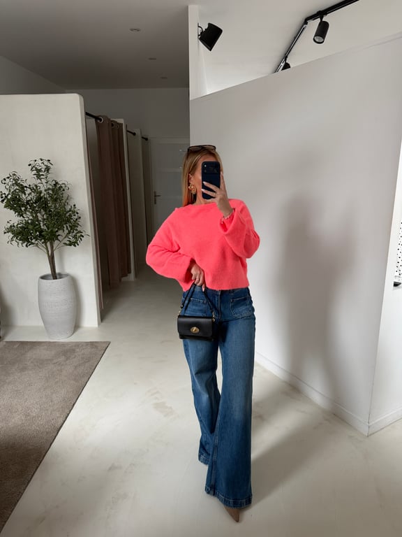 Pull doux col rond corail fluo : le haut cocooning et lumineux qui dynamise votre dressing. Ce pull femme séduit par sa maille douce et confortable, idéale pour un look cosy tout en restant tendance. Sa coupe col rond classique s’associe facilement avec un jean, un pantalon ou une jupe pour une silhouette moderne. À porter avec vos accessoires et chaussures préférés pour un style casual chic, plein de pep’s.