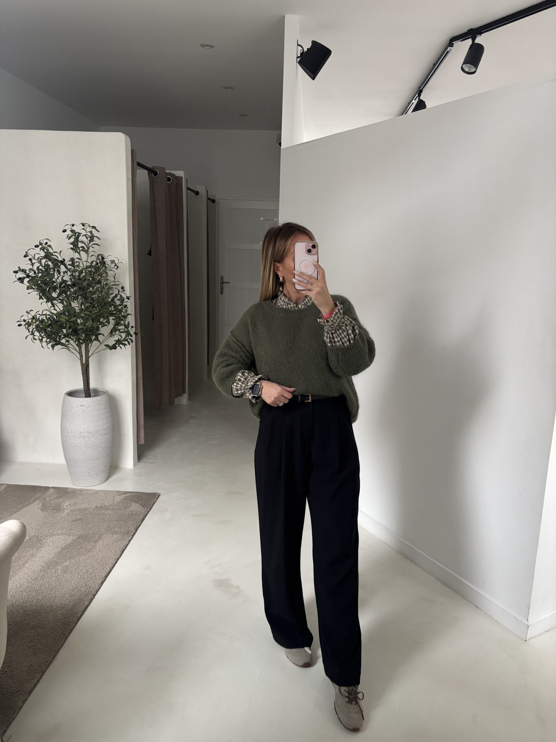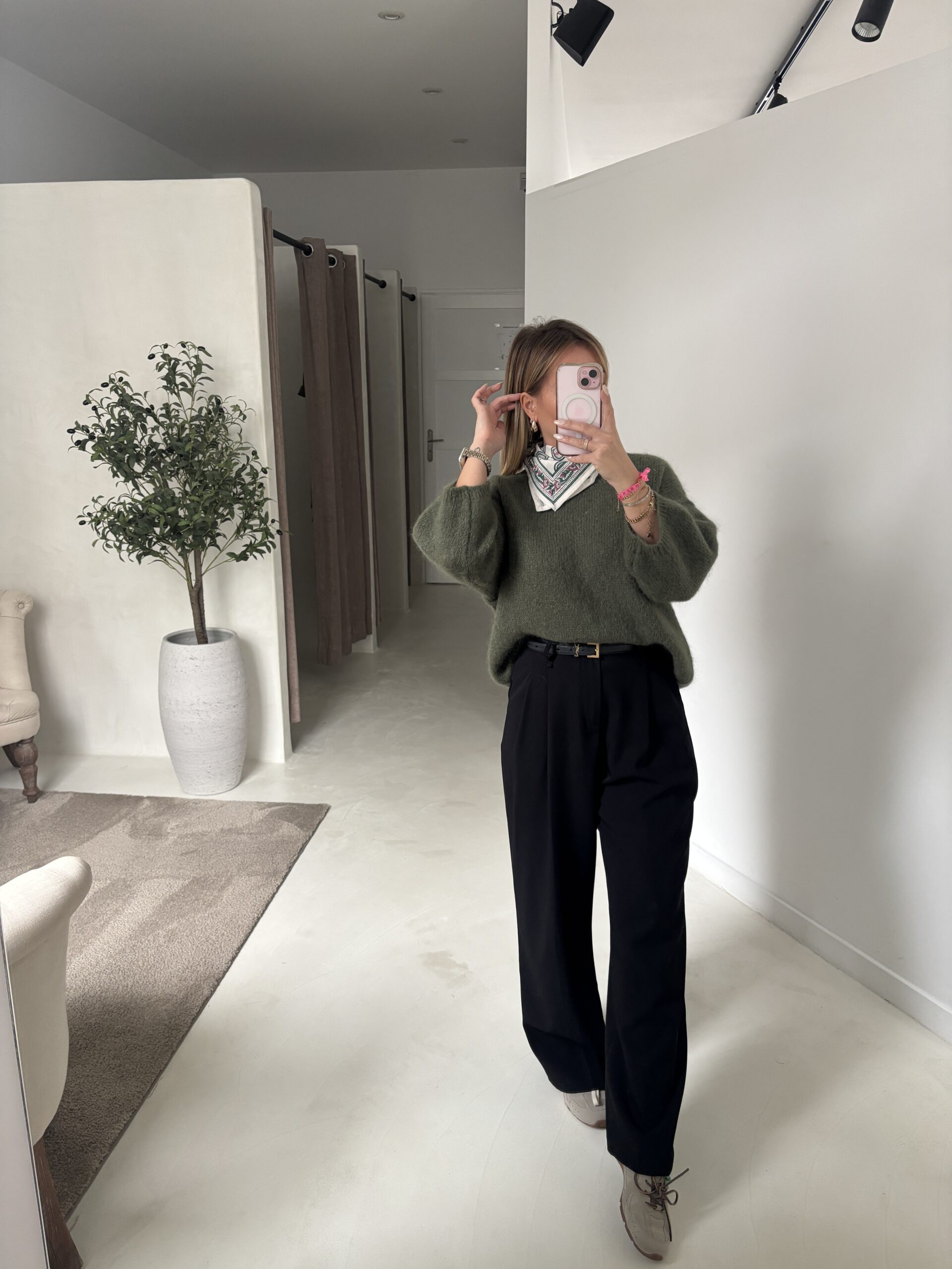 Pull kaki manches 3/4, détails coutures