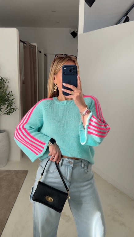 Le pull manches 3/4 bleu ciel avec bandes roses sur les manches est un haut tendance et confortable, parfait pour apporter une touche de couleur à un look quotidien. Les bandes contrastantes ajoutent du style et du dynamisme à la pièce.