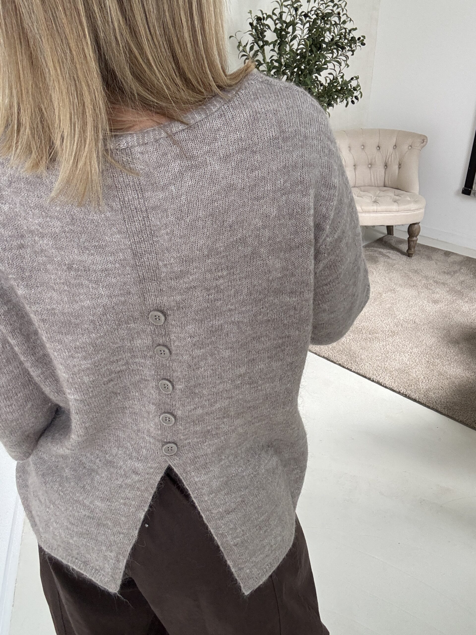 Ce pull féminin est confectionné dans une maille mélangée douce et présente des manches courtes, une encolure en V et une coupe décontractée. Le dos est agrémenté d’une rangée de boutons et d’une fente subtile pour une touche d’originalité