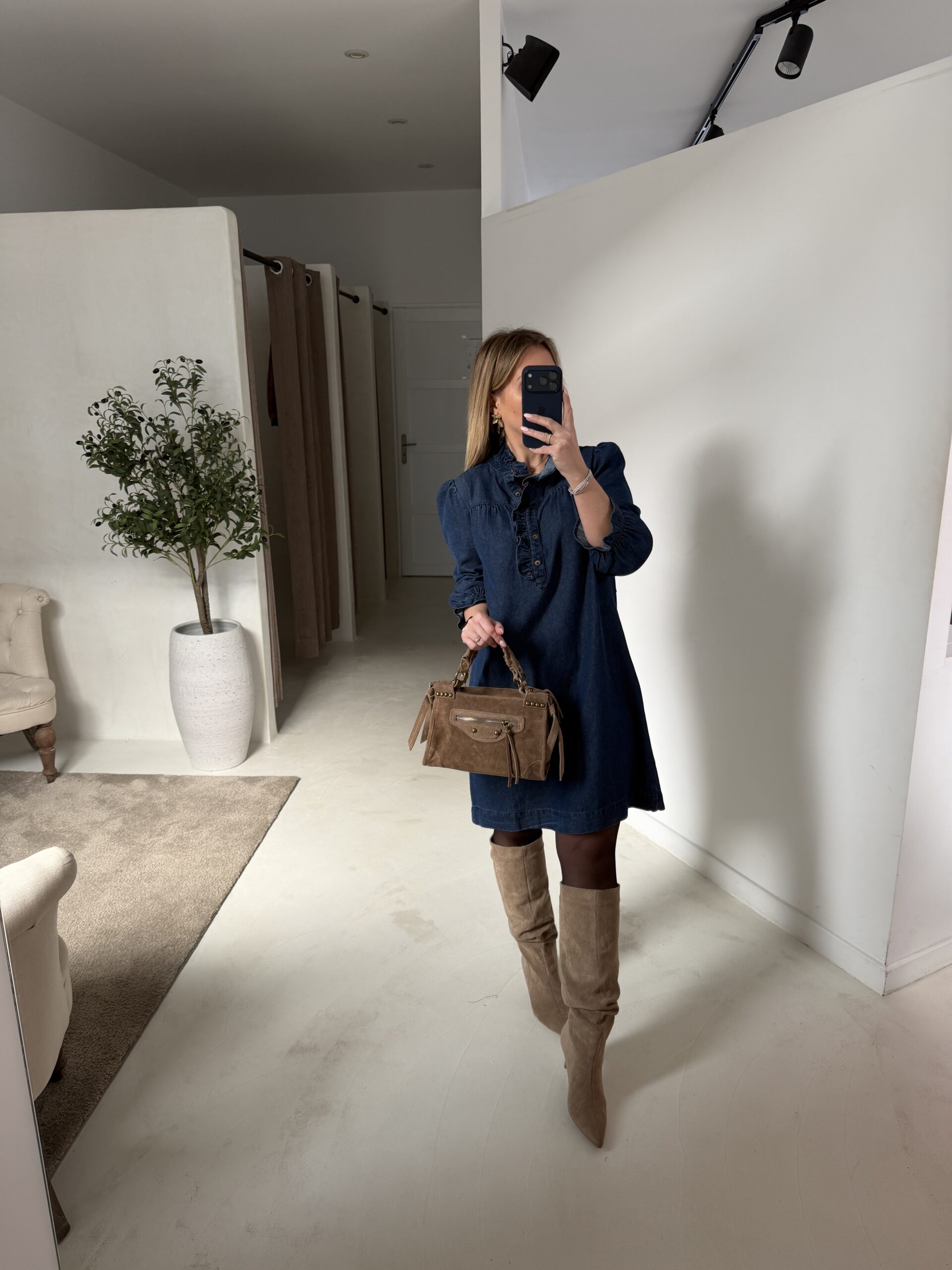 Cette robe en denim brut est une pièce féminine et tendance, parfaite pour un look casual chic. Sa matière denim, résistante et intemporelle, assure un style à la fois moderne et confortable. Les volants au col apportent une touche romantique et délicate, qui fait toute la différence.
