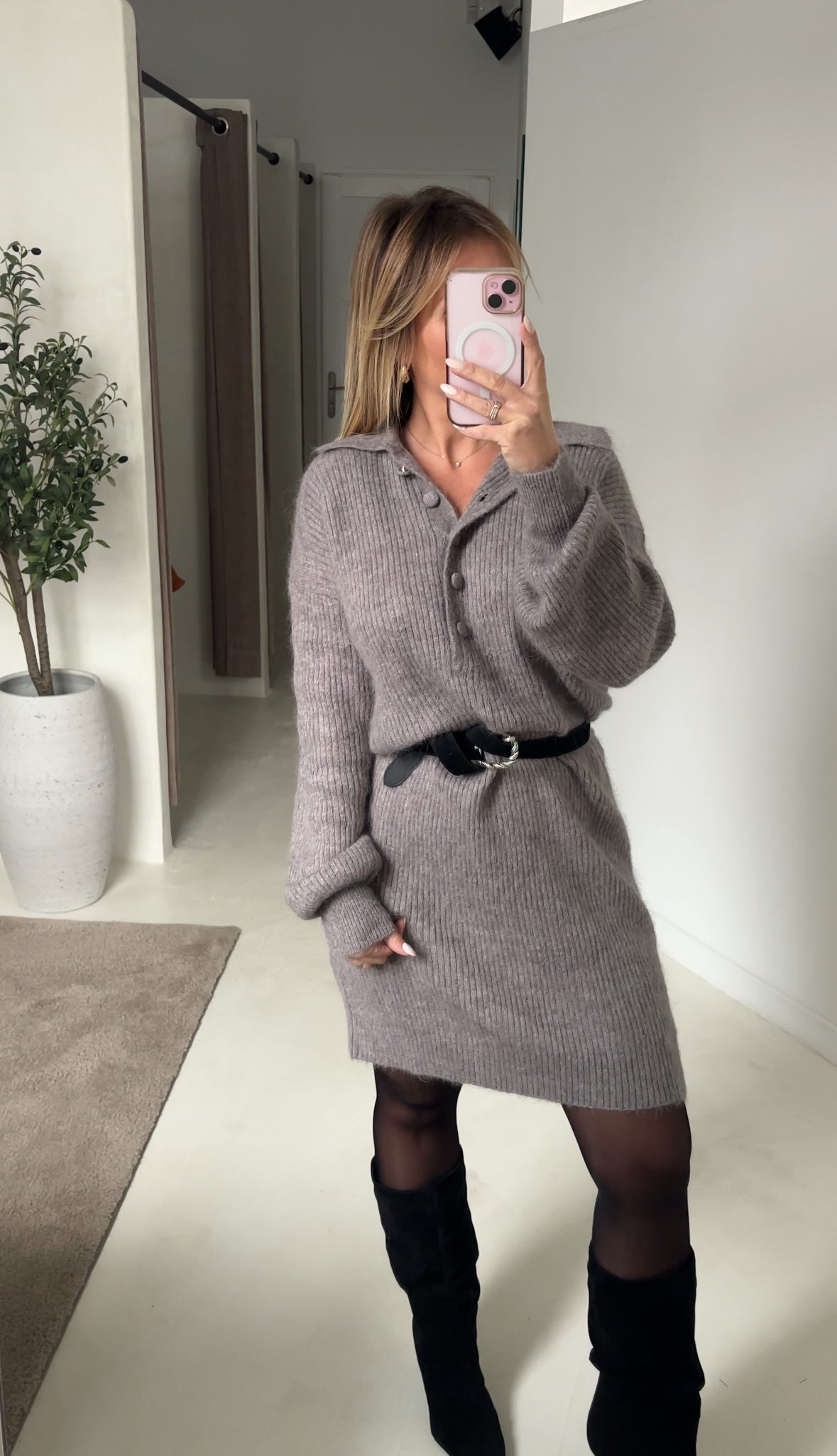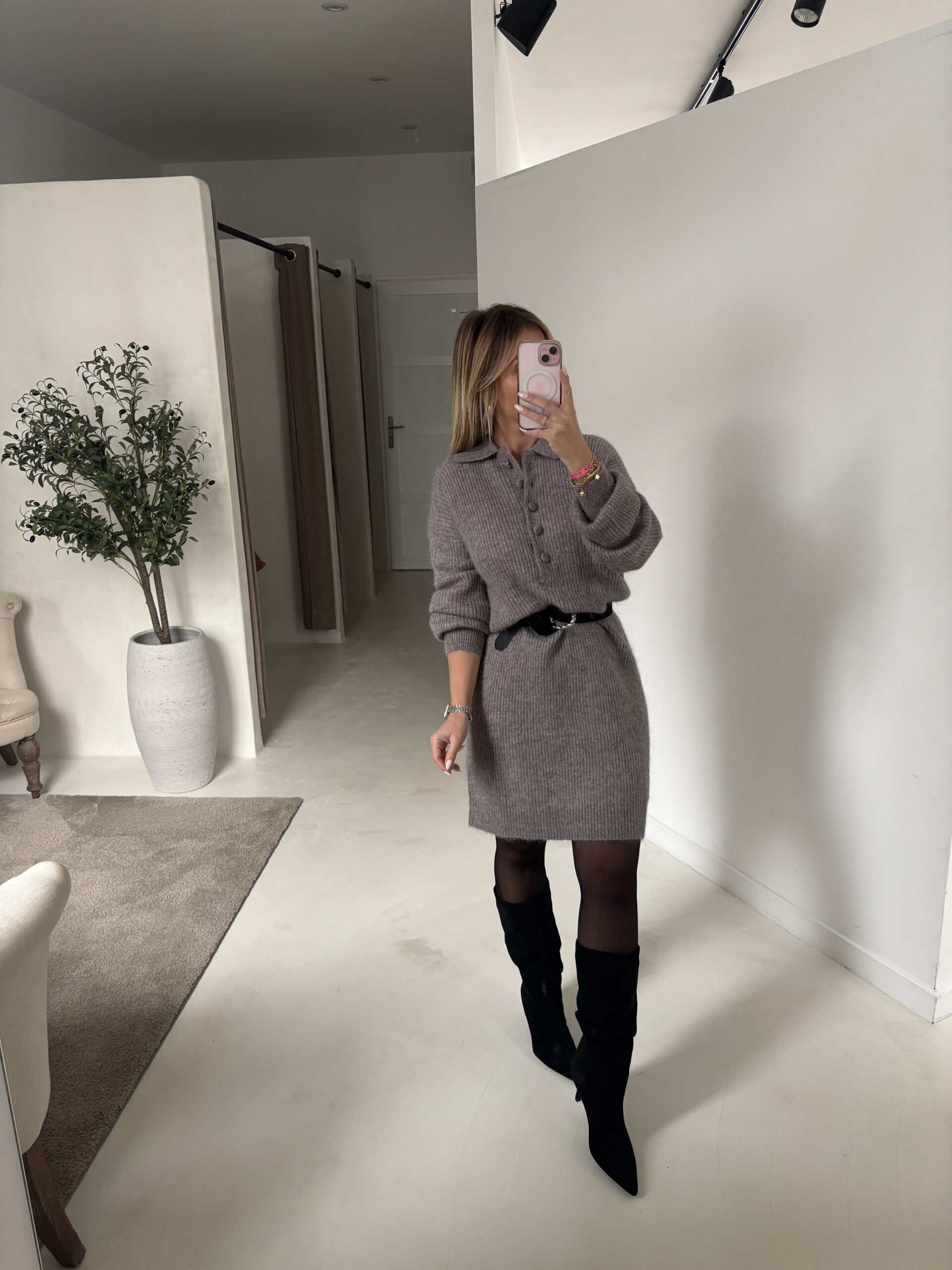 Robe midi en maille gris avec col et boutons