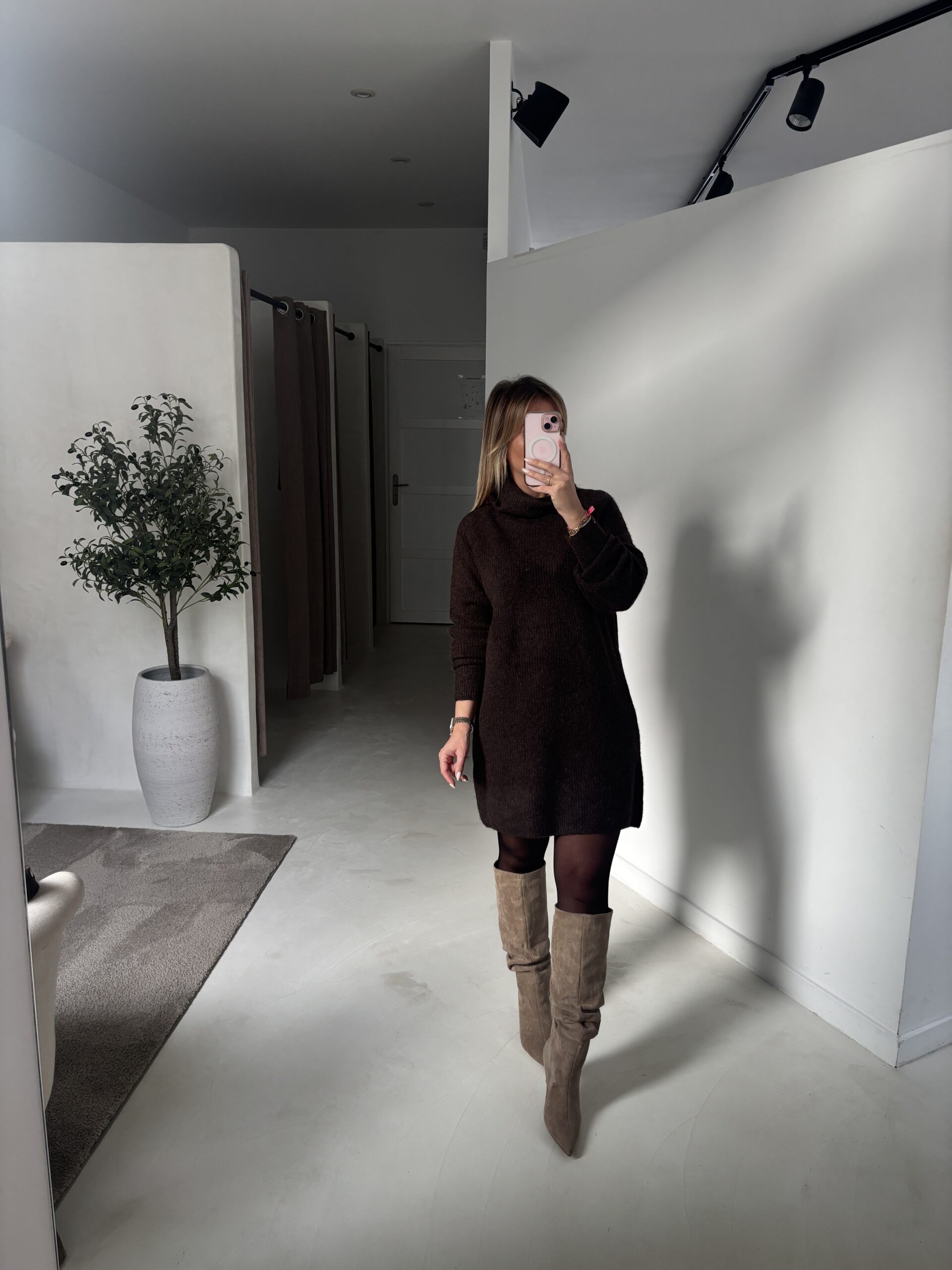 Robe pull femme en maille douce, avec un col roulé confortable et élégant. On aime sa couleur marron chaleureuse, parfaite pour l’automne-hiver. À porter avec des bottes, des baskets ou une ceinture pour un look chic et cosy à la fois.
