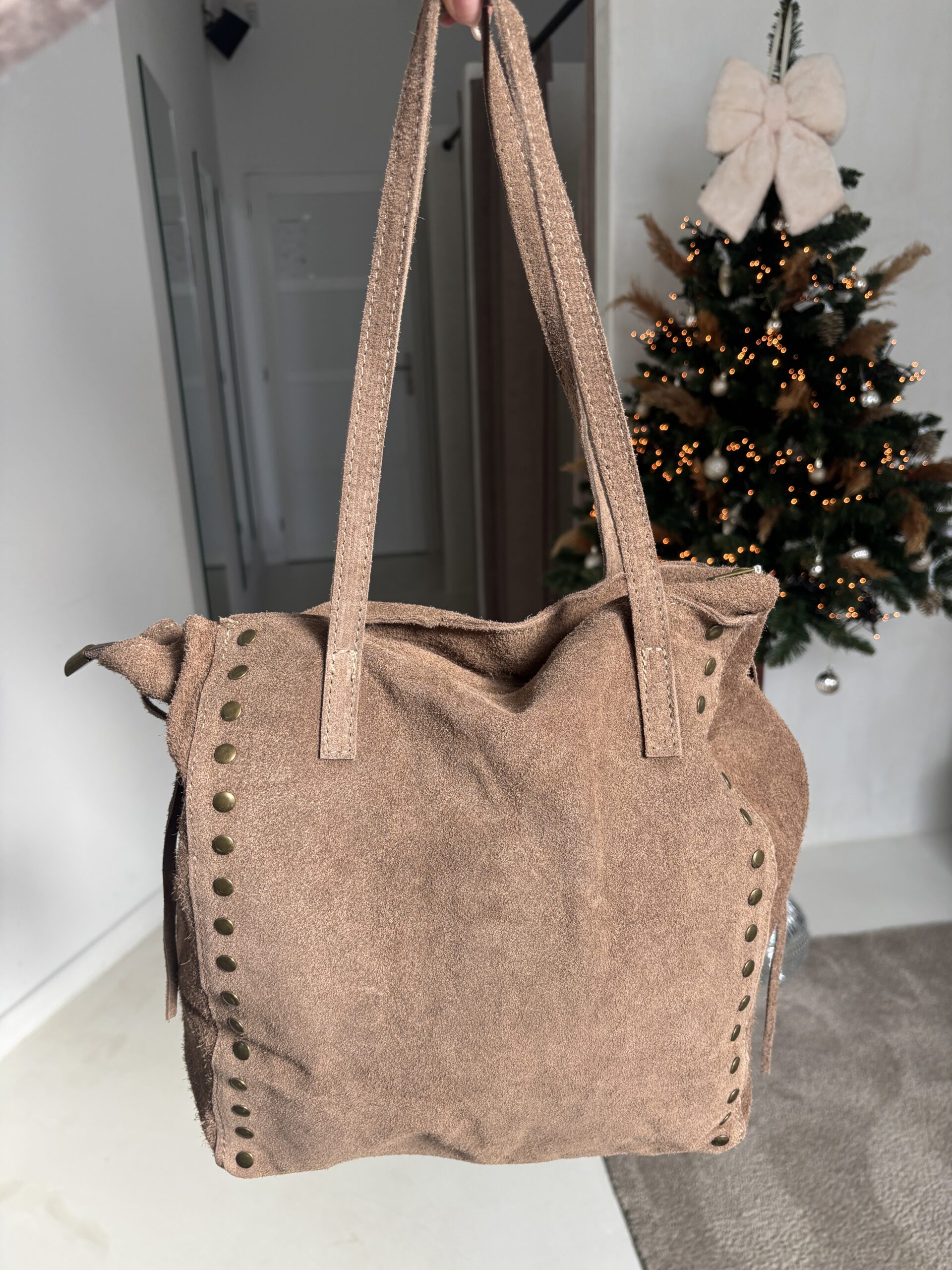 Ce grand sac à main en daim kaki allie élégance et praticité. Ses détails clous apportent une touche moderne et tendance, tandis que sa taille généreuse permet de transporter toutes vos affaires facilement. Polyvalent, il se porte à la main ou à l’épaule et complète parfaitement vos accessoires pour un look chic et contemporain.
