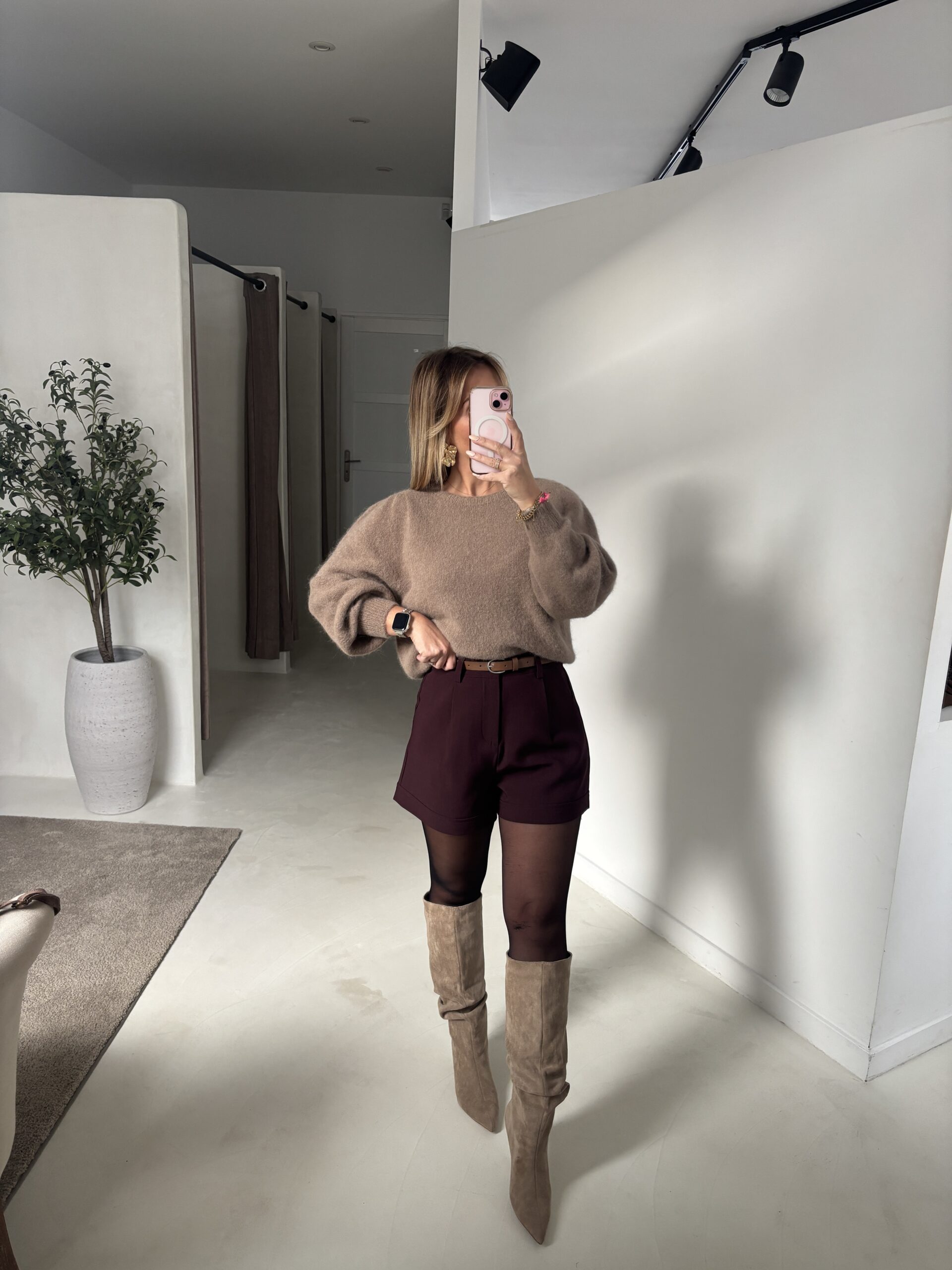 Short bordeaux femme à la coupe chic et structurée, parfait pour un look élégant en toute saison. On adore ses pinces sur le devant qui affinent la silhouette et lui donnent une allure raffinée. À porter avec une blouse fluide, un gilet ou un blazer pour un style tendance et féminin.