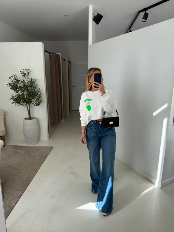 Sweat large blanc taille unique avec inscription matcha vert fluo : le haut tendance et décontracté qui apporte une touche de pep’s à votre dressing. Ce sweat femme séduit par sa coupe oversize confortable et son inscription colorée vert fluo pour un style moderne et affirmé. Facile à porter avec un jean, un pantalon ou un short, il s’associe parfaitement à vos gilets, accessoires et chaussures pour un look casual chic, street et ultra tendance.