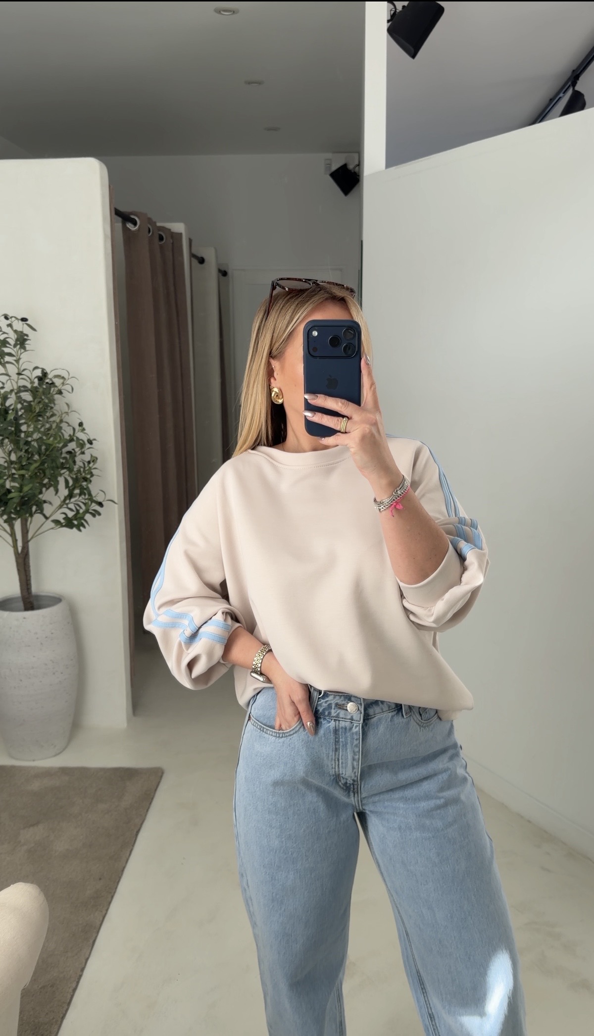 Sweat oversize beige avec bandes bleu