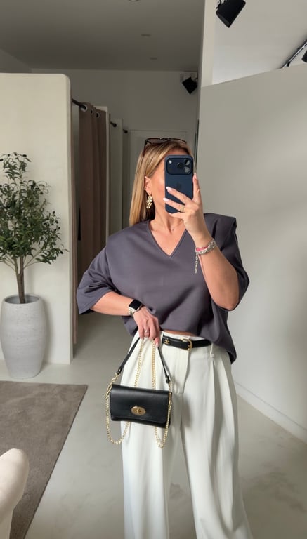 Le t-shirt à épaulettes gris col V taille unique est un haut moderne et tendance, parfait pour structurer la silhouette tout en restant confortable. Les épaulettes apportent une touche chic et actuelle à la pièce.