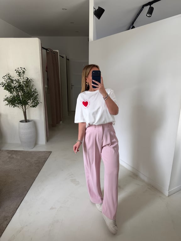 T-shirt blanc avec inscription brodée « Que du love » et cœur rouge devant et dans le dos : le haut femme tendance et plein de douceur à adopter au quotidien. Ce t-shirt femme séduit par sa coupe confortable et ses détails brodés qui apportent une touche originale et féminine. Facile à porter avec un jean, un pantalon ou une jupe, il s’associe parfaitement à vos gilets, pulls et accessoires pour un look casual chic, moderne et plein de good vibes.